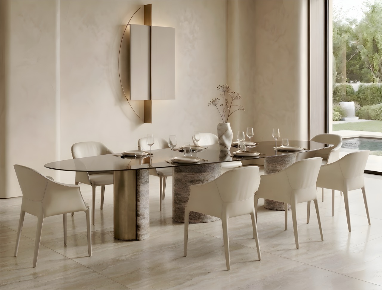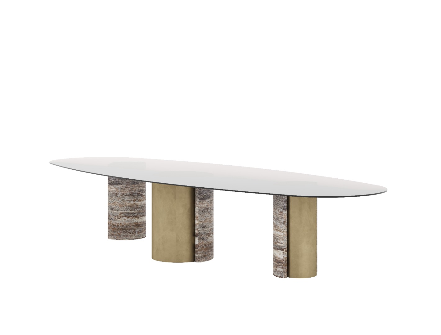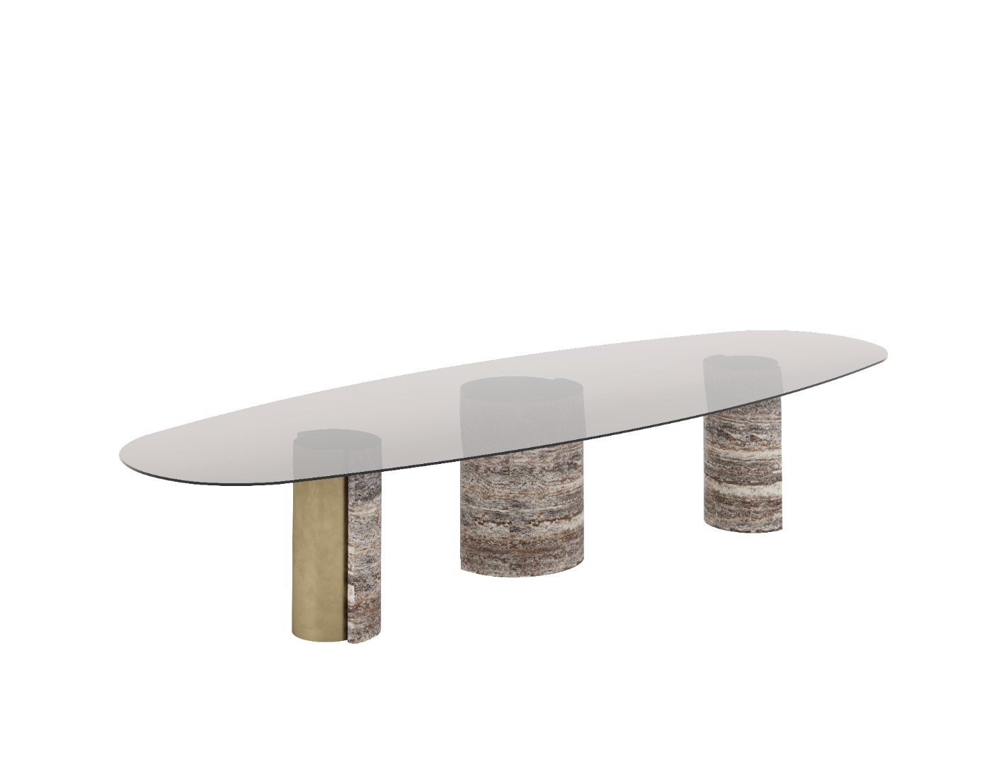 Cam tabla yüzey ile traverten ayakların doğal uyumu, sade ve güçlü bir duruş sunar.