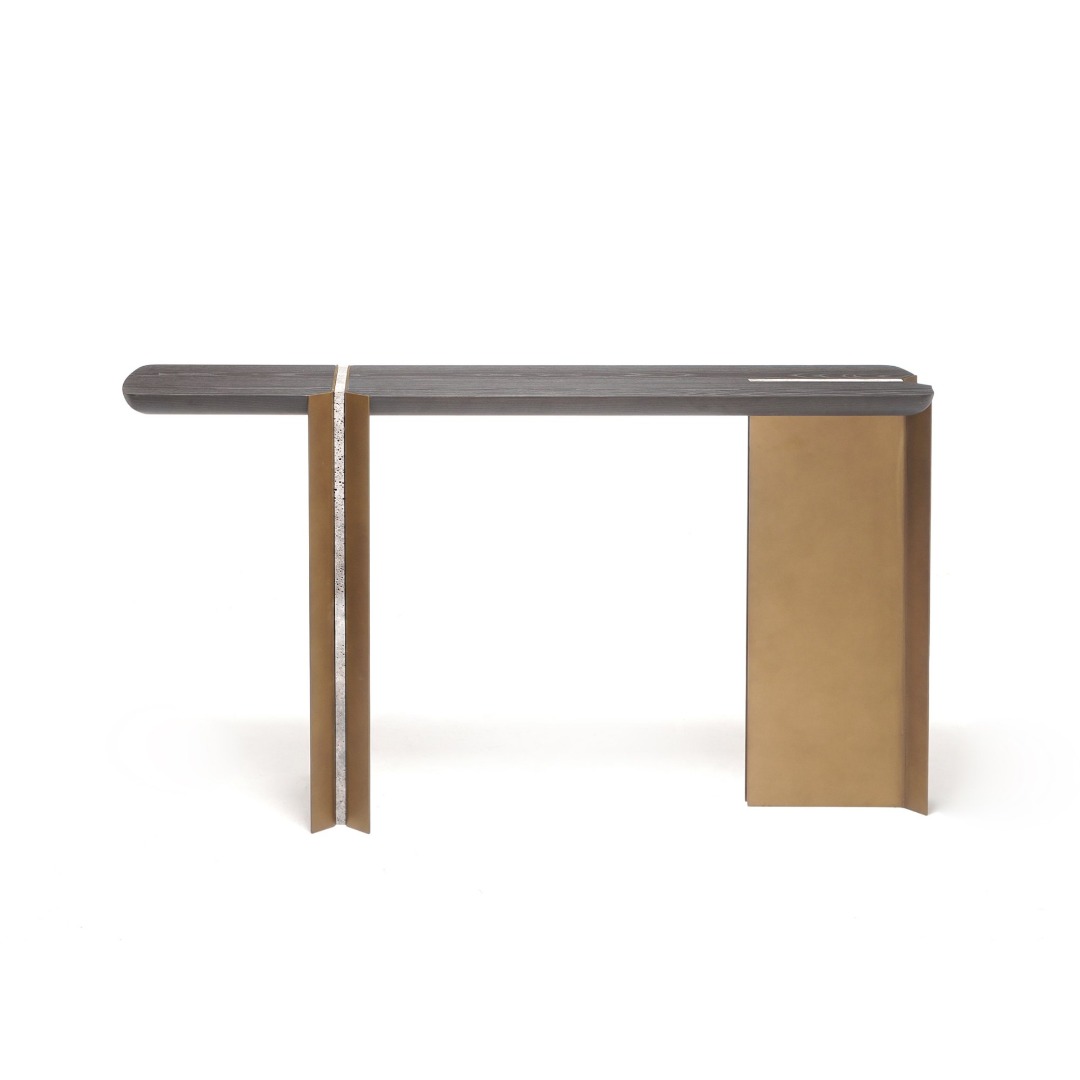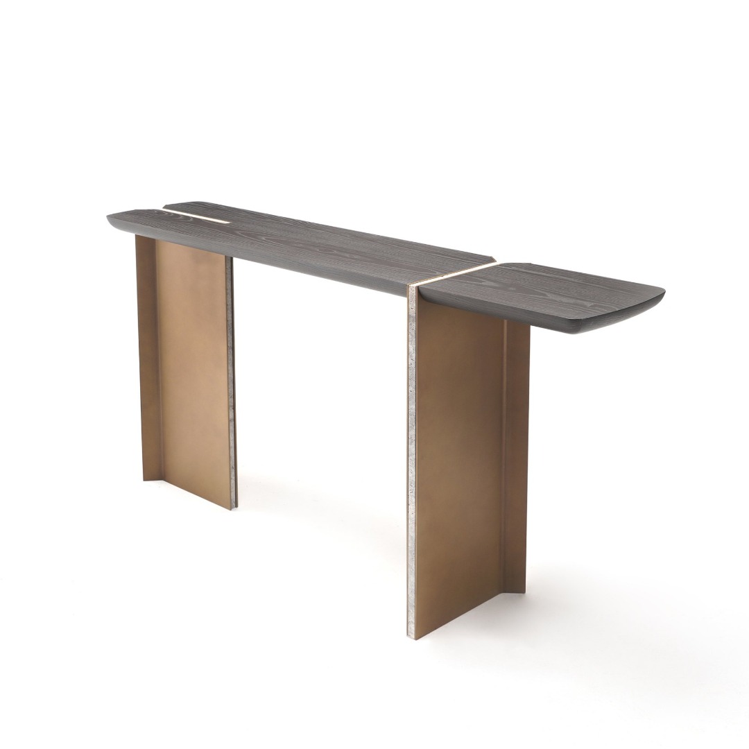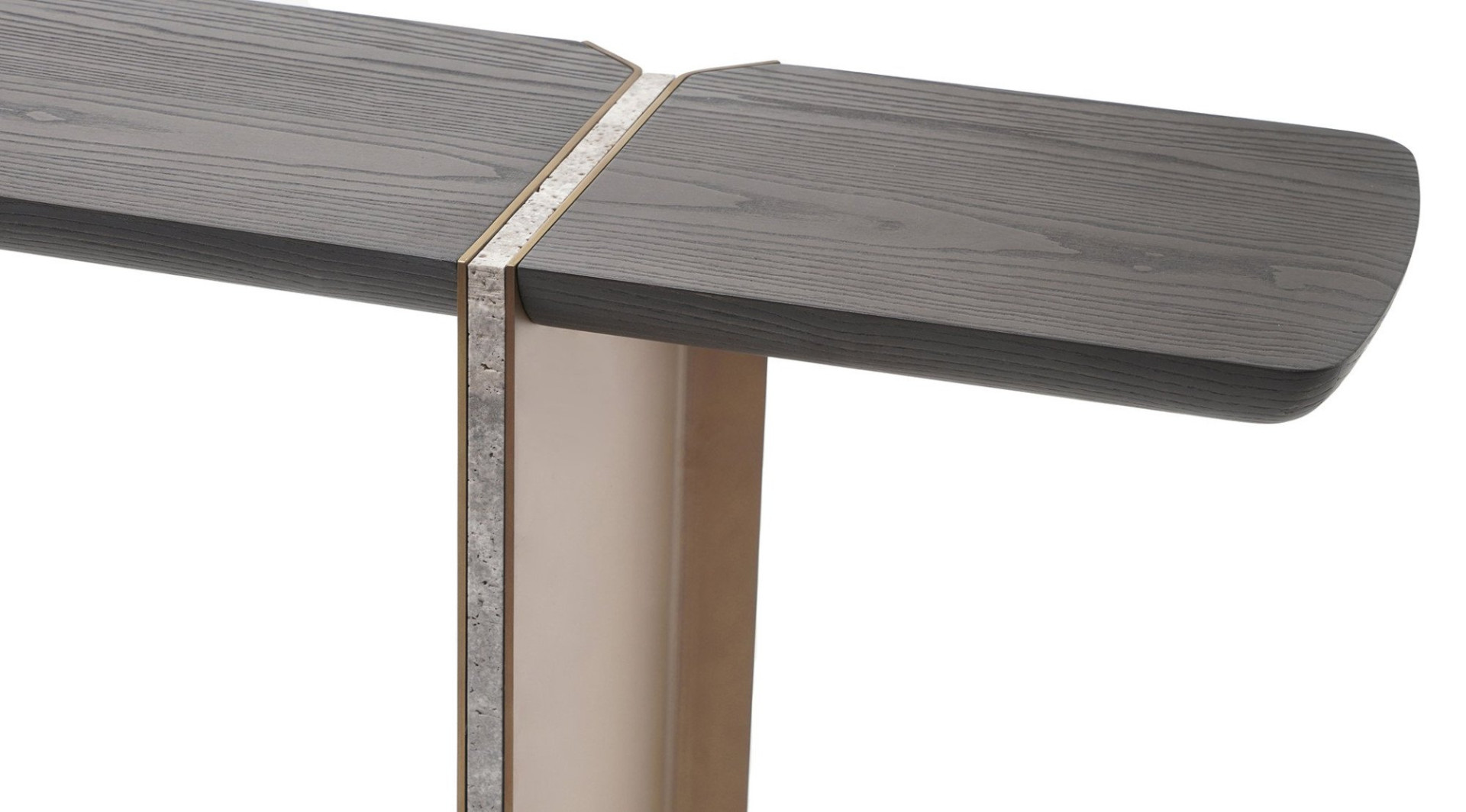 A self-standing product with a steady aesthetic identity and refined details, Bridge Console adorns entryways, living rooms, hospitality areas, and retail spaces with striking architectural zest. The swallowtail metal supports lined with marble strips and contrasting solid wood elements are the shared features of The Foil Collection, The Discovery Wall Units, and The Bridge Console. The sanded solid wood top, metal supports, and marble lining have diverse color options.
