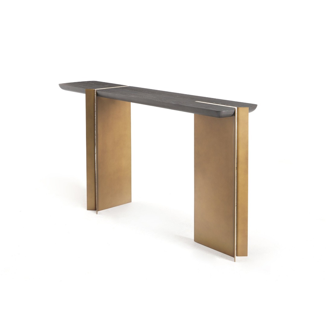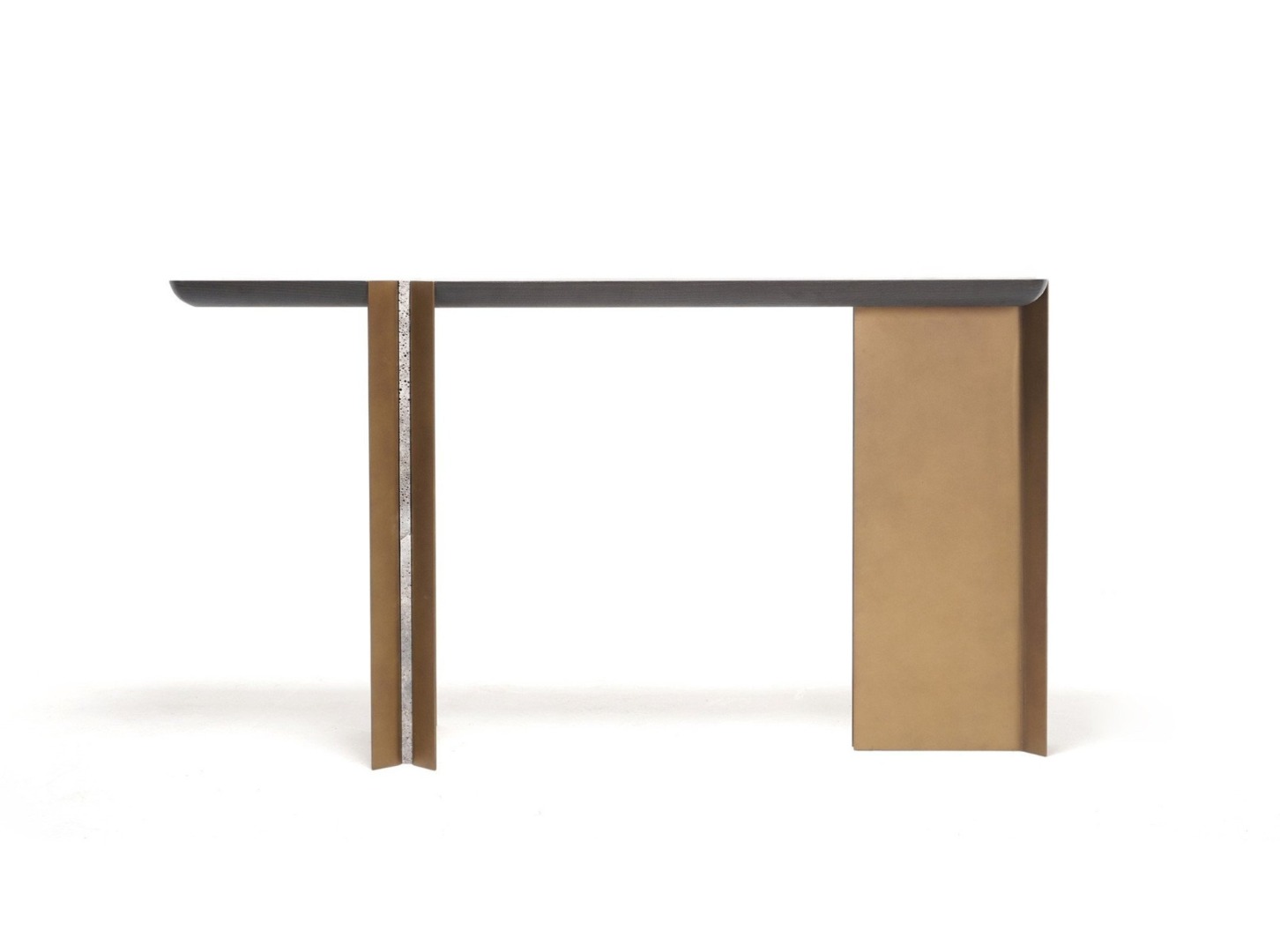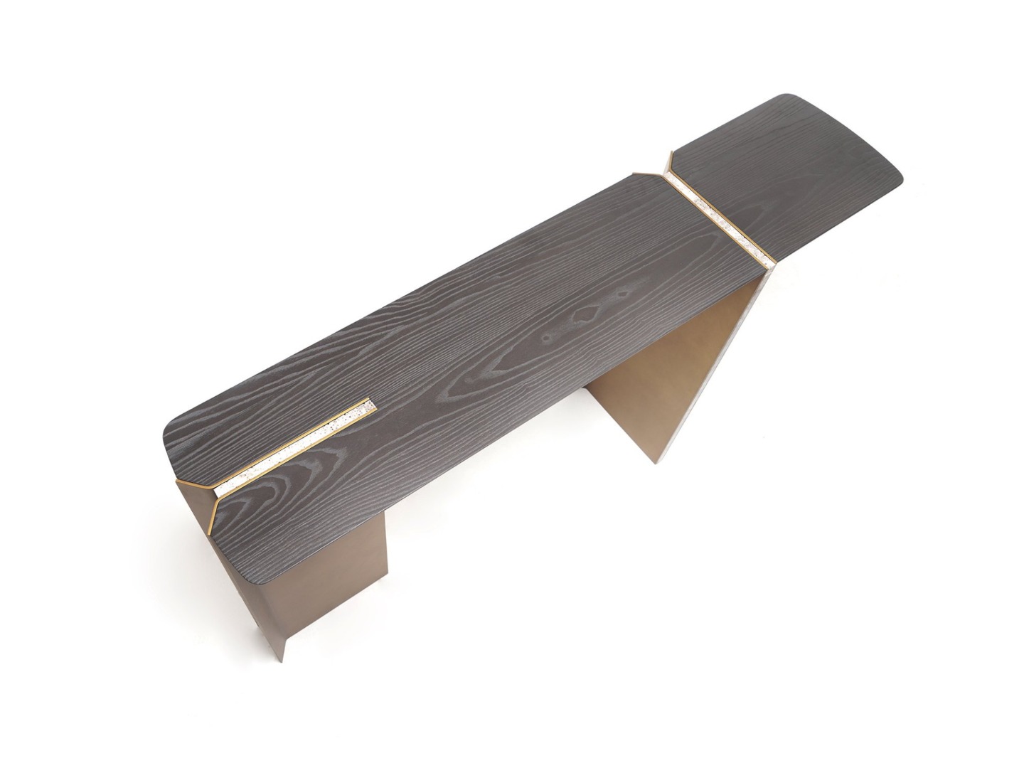 A self-standing product with a steady aesthetic identity and refined details, Bridge Console adorns entryways, living rooms, hospitality areas, and retail spaces with striking architectural zest. The swallowtail metal supports lined with marble strips and contrasting solid wood elements are the shared features of The Foil Collection, The Discovery Wall Units, and The Bridge Console. The sanded solid wood top, metal supports, and marble lining have diverse color options.