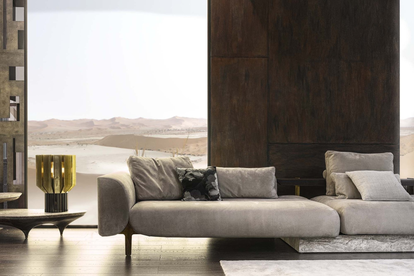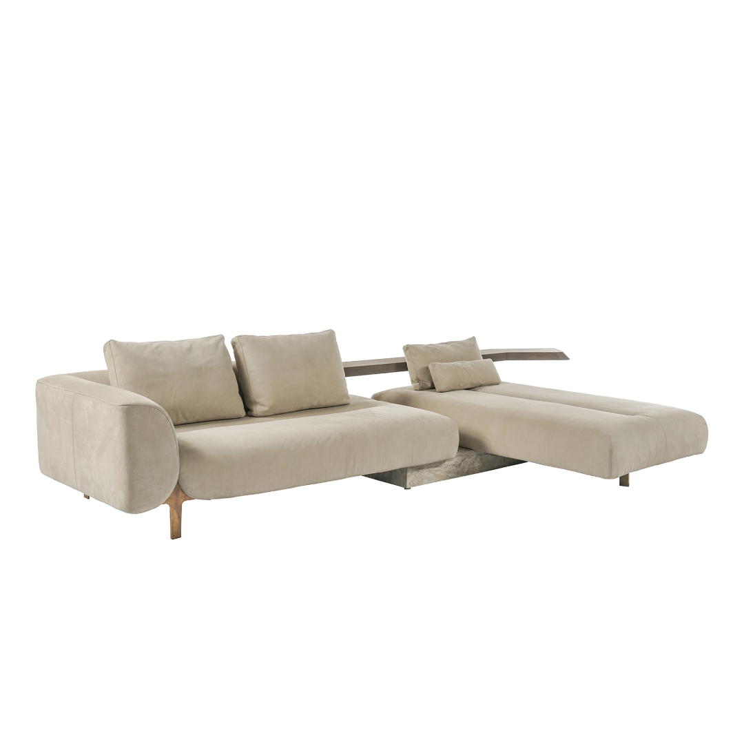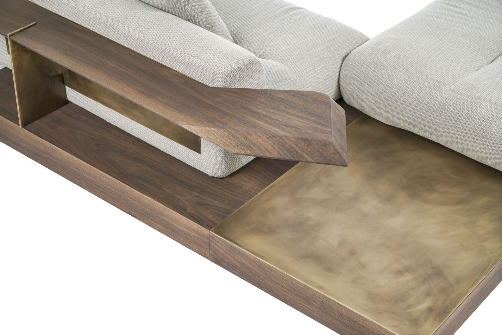 Be ready to discover the nature of comfort. The perfect harmony of walnut cover and aged brass meets with the unmatched texture of travertine marble. Canyon Sofa which reflects the perfect lines of nature brings your home a brand new concept of comfort.