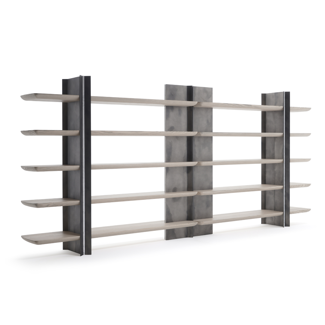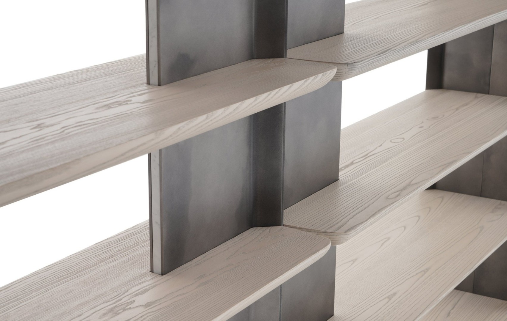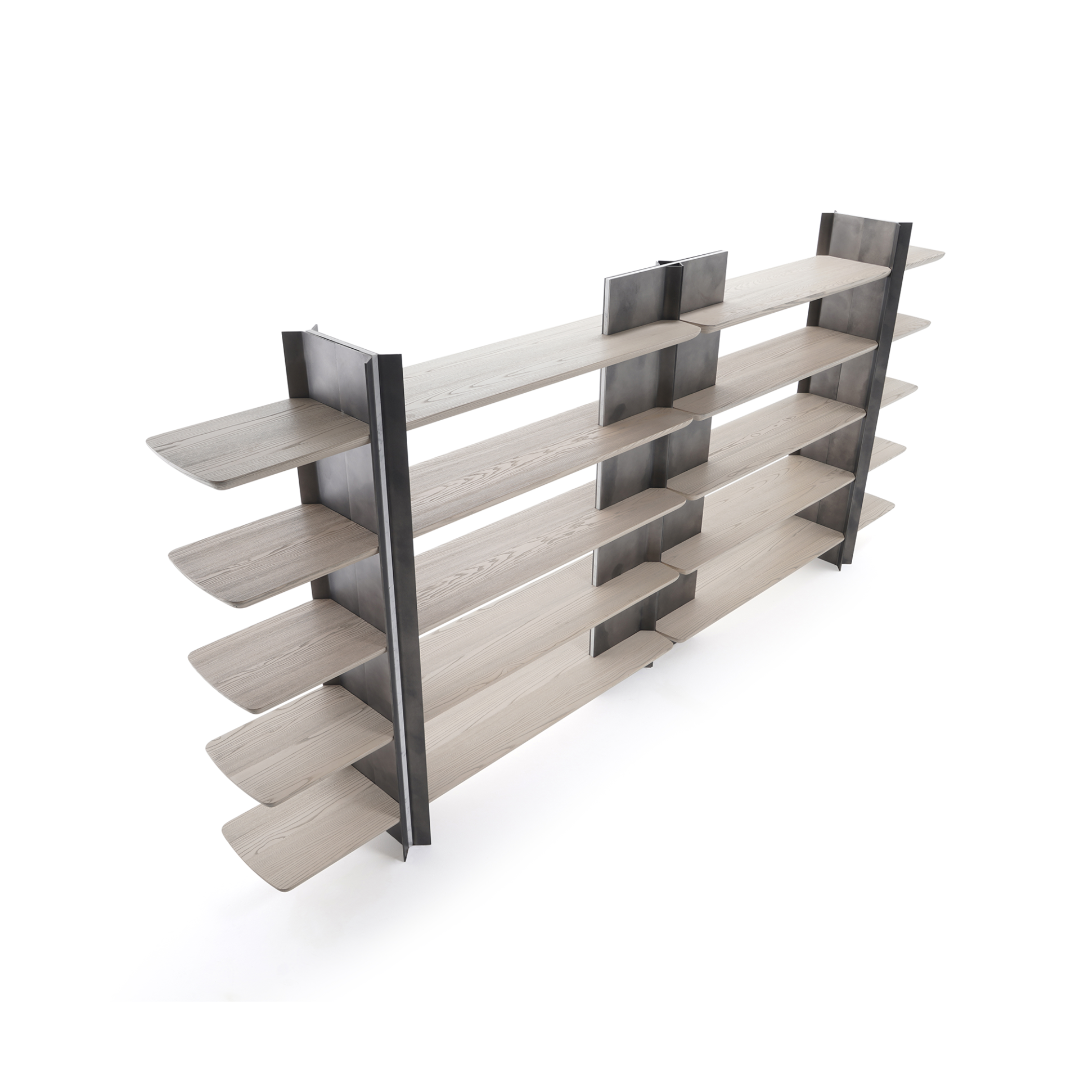 A single module of Discovery Bookshelf is a complex composition of five solid wood shelves to store the objects of life, braced by four metal posts where the middle supports are stationed perpendicular to the side supports. The extensive choice of finishes and shades promises numerous personalized configurations and solutions.