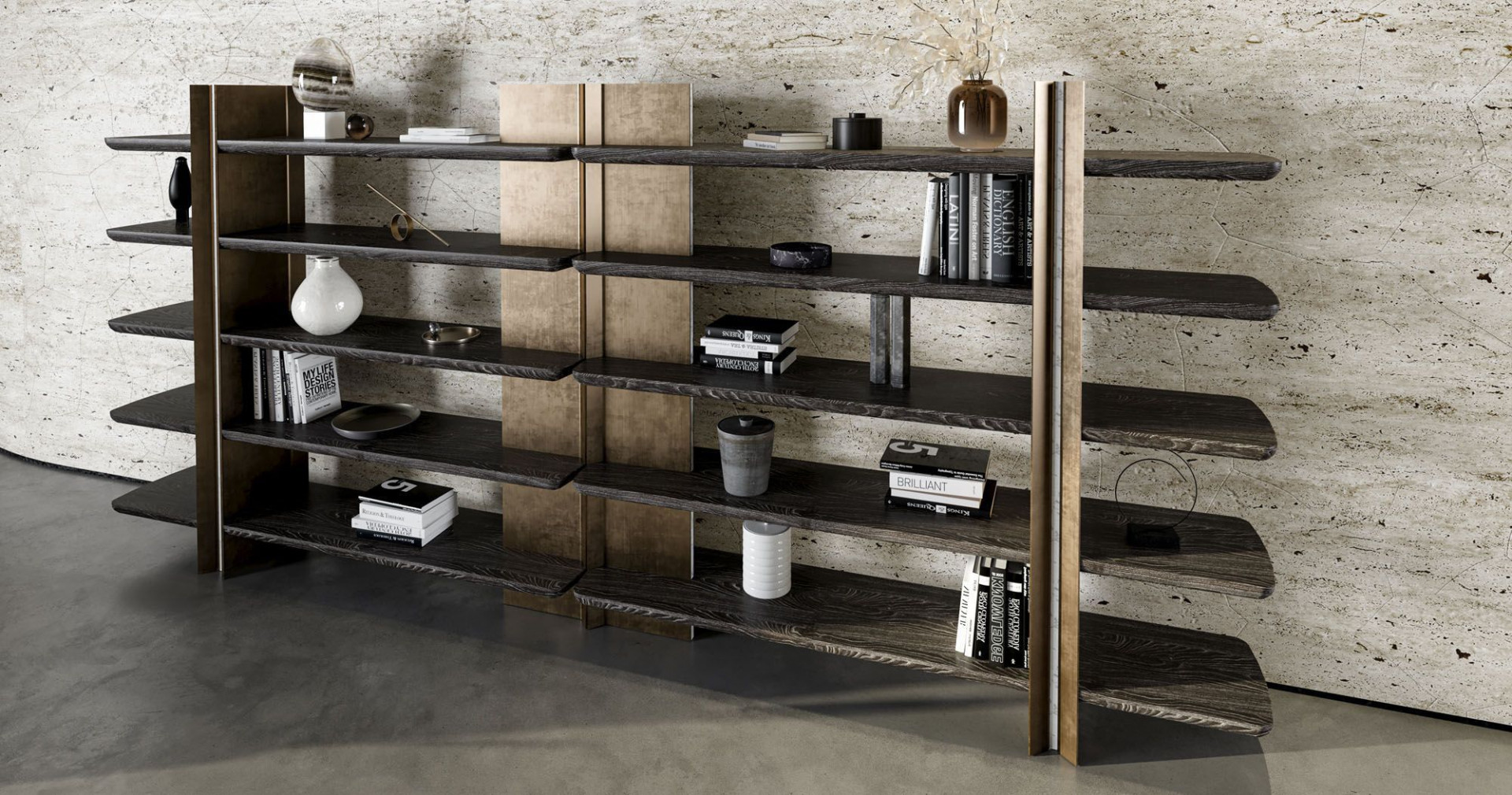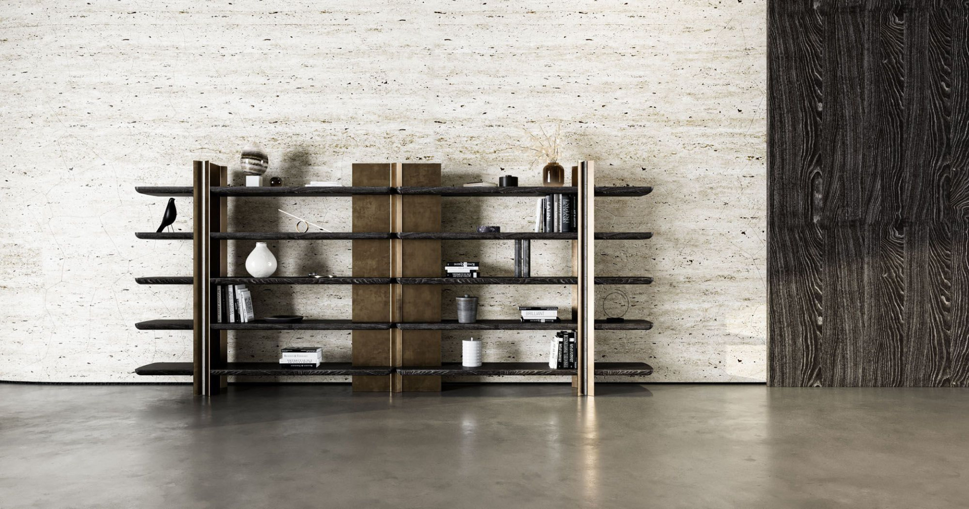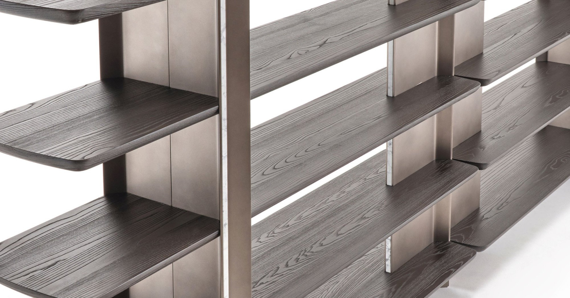 A single module of Discovery Bookshelf is a complex composition of five solid wood shelves to store the objects of life, braced by four metal posts where the middle supports are stationed perpendicular to the side supports. The extensive choice of finishes and shades promises numerous personalized configurations and solutions.