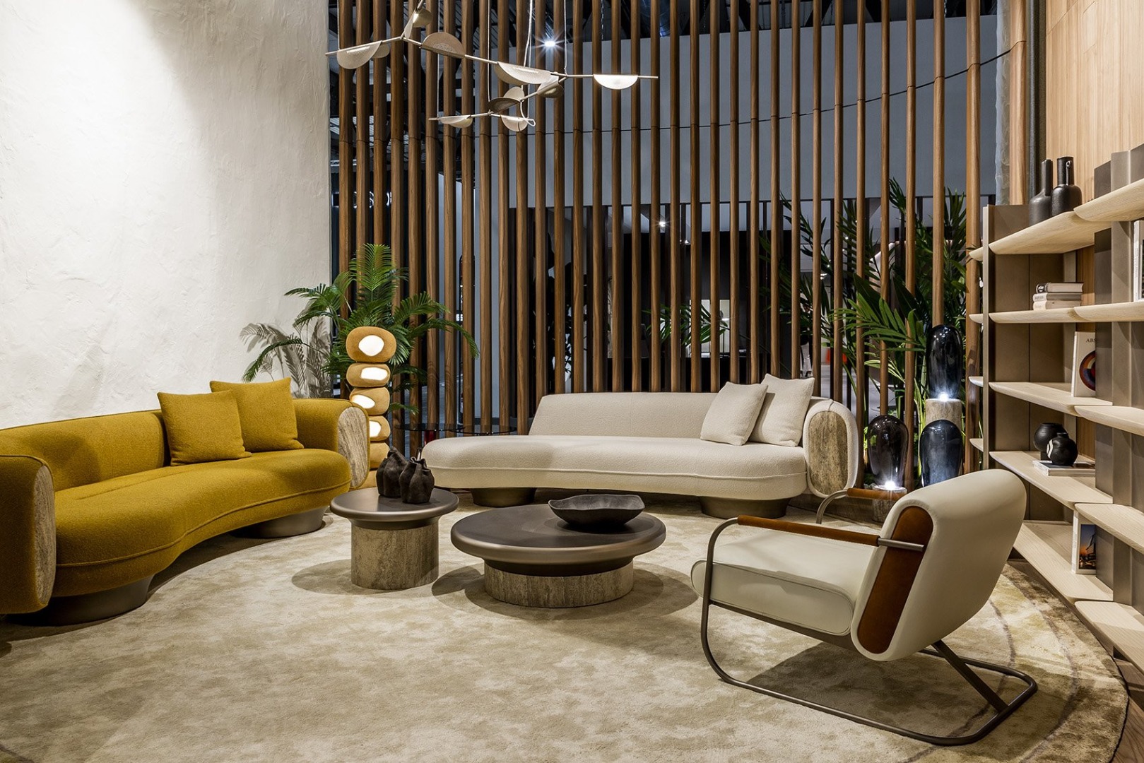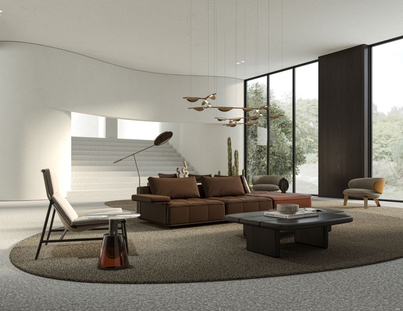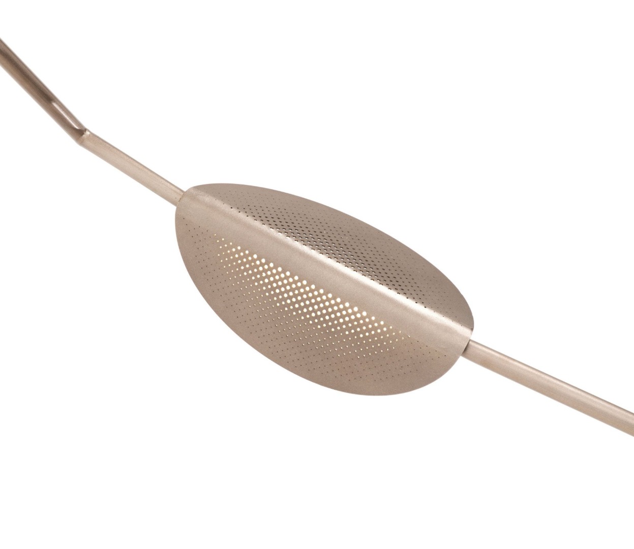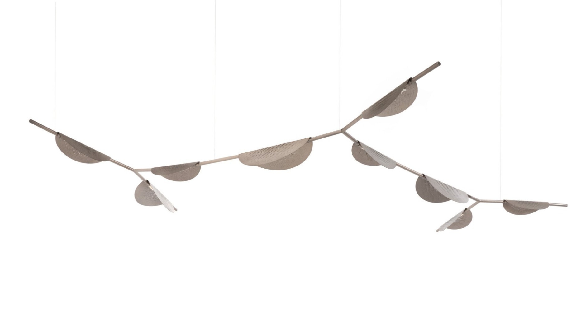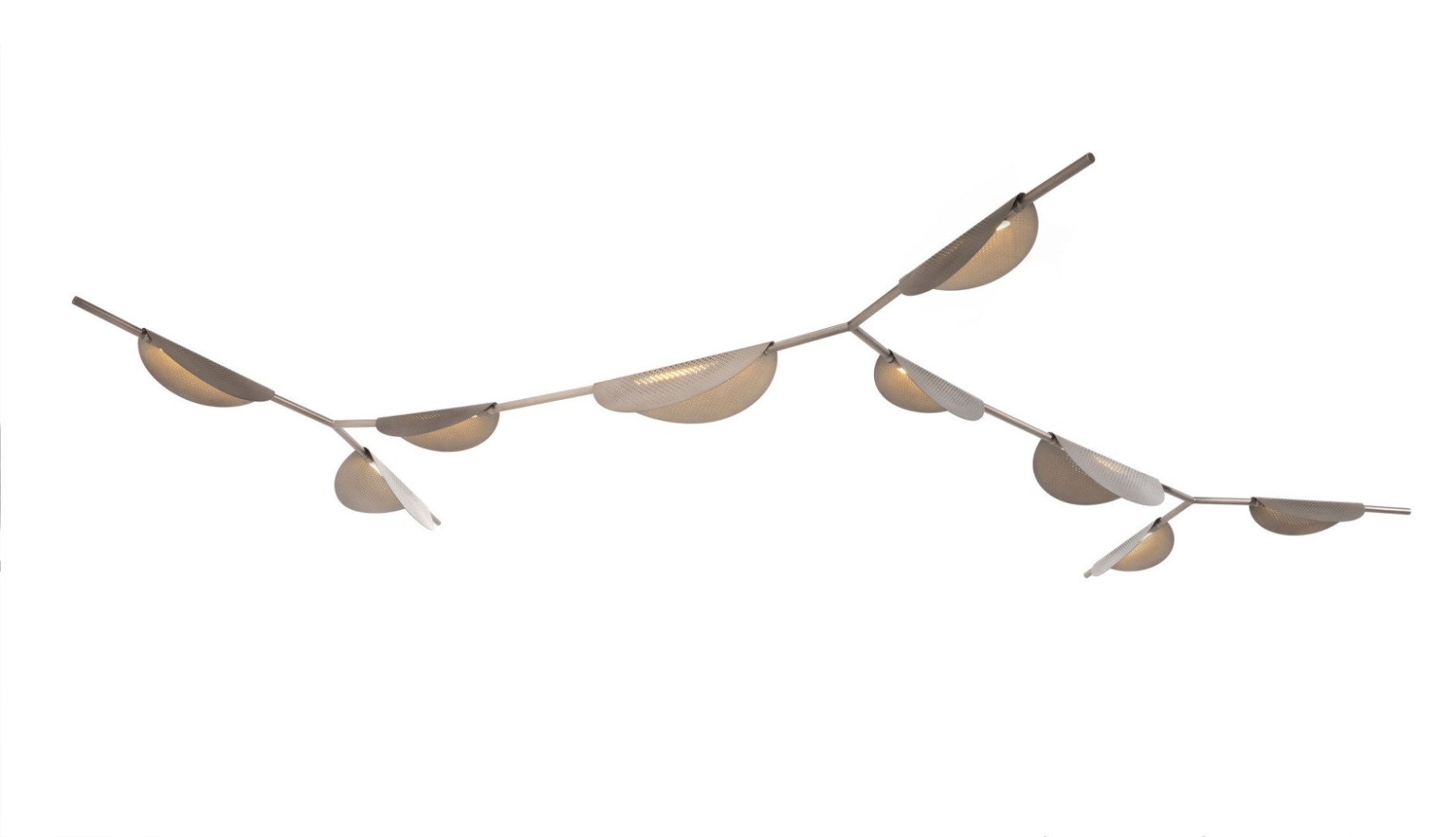 An influential tribute to the modularity and flexibility of the mother earth, the Half Moon Light consists of tubular LED strips that hide behind leaf-like shades tied to a metal rod frame reminiscent of a branch. Perforated sheet metal shades come in two sizes and various colors. Once attached to the rods, they can easily be tilted to change the direction of the light. Available in pendant, floor and wall lamp, and table lamp options, Half Moon Lighting System brings hefty artistic essence to any interior space, whether used as a large installation or a single unit lighting. The table and floor lamp come with circular marble bases. The modular hanging frame is available in two, three, or five shaded versions and a straight or crooked linear body, fit to accompany a rectangular dining/ meeting table. Suitable for hotels, restaurants, showrooms, or any other public space, as well as private living and dining rooms.