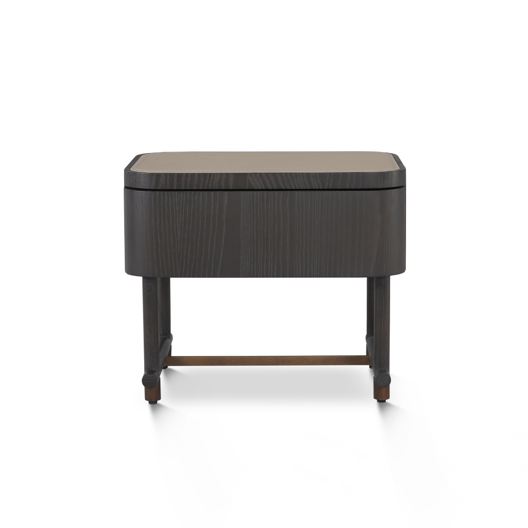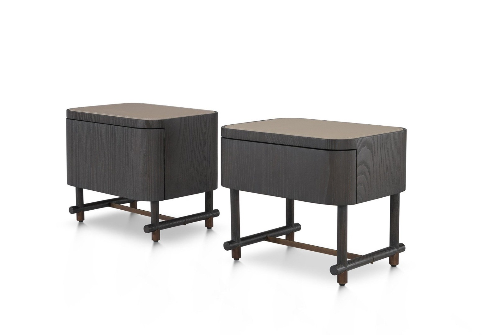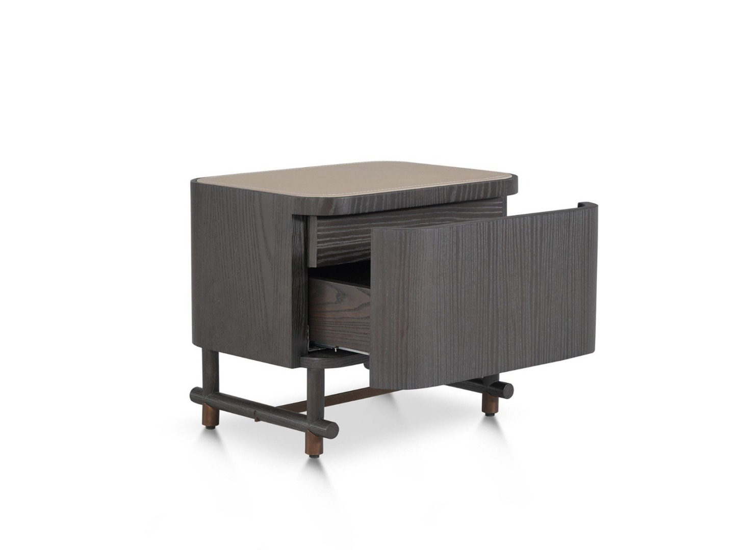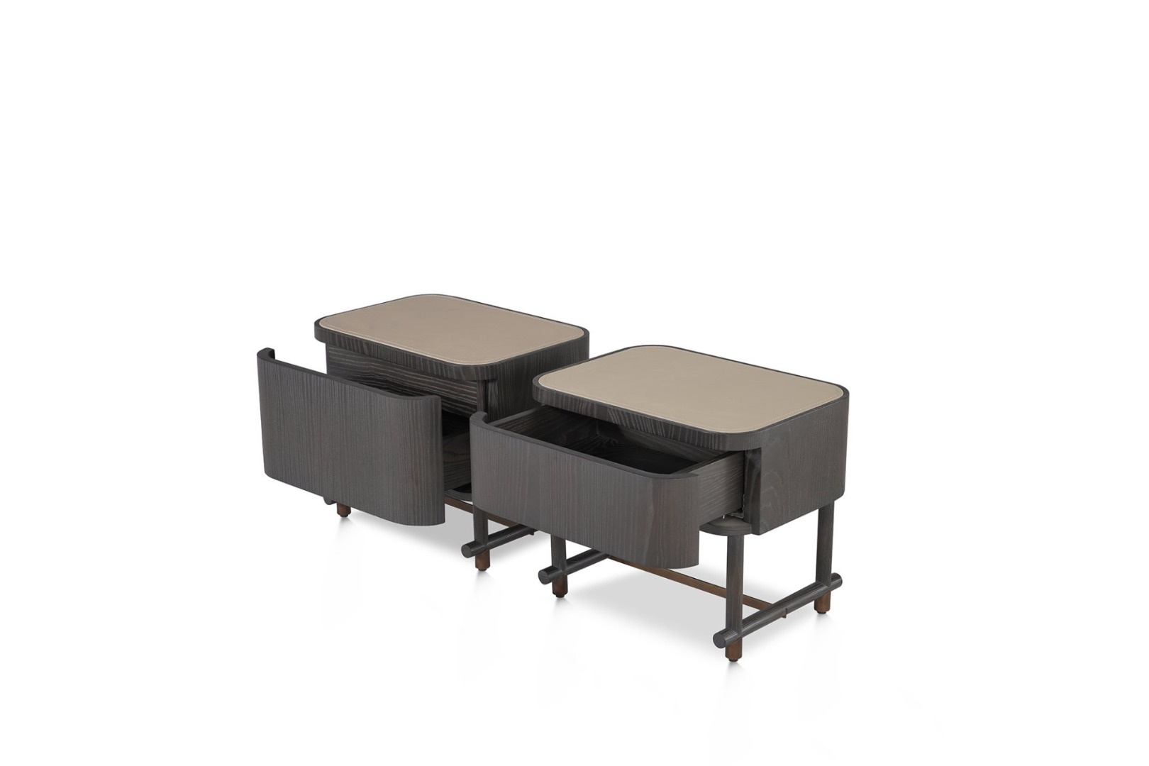 Kimono Nightstands come in two different sizes; the larger container withholds an extra drawer. Leather or nubuck coatings encrust the top layers of the wood veneered cases, and added metal leg details convey opulence to the design. Leather, wood, and metal elements have diverse color/ texture options.