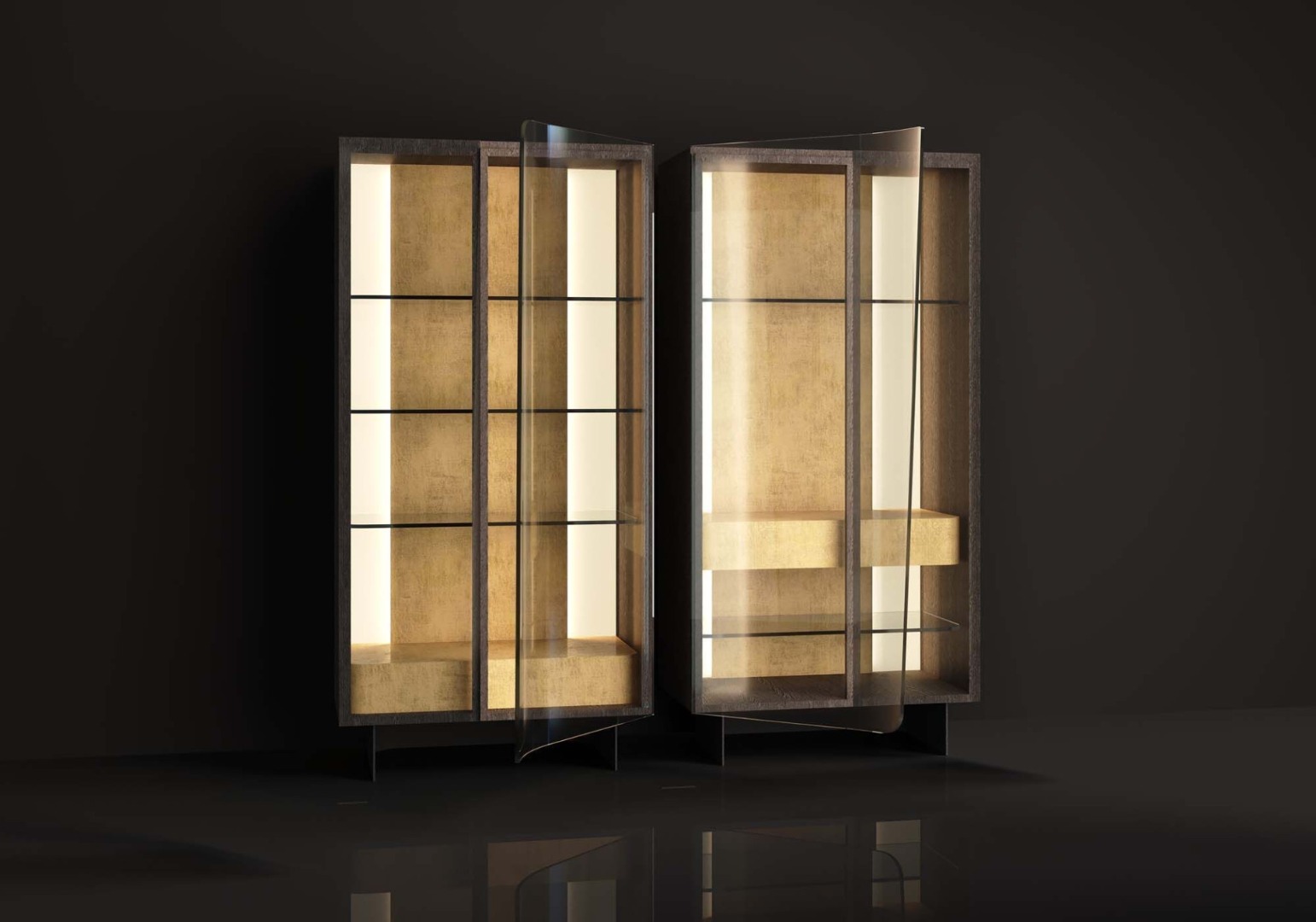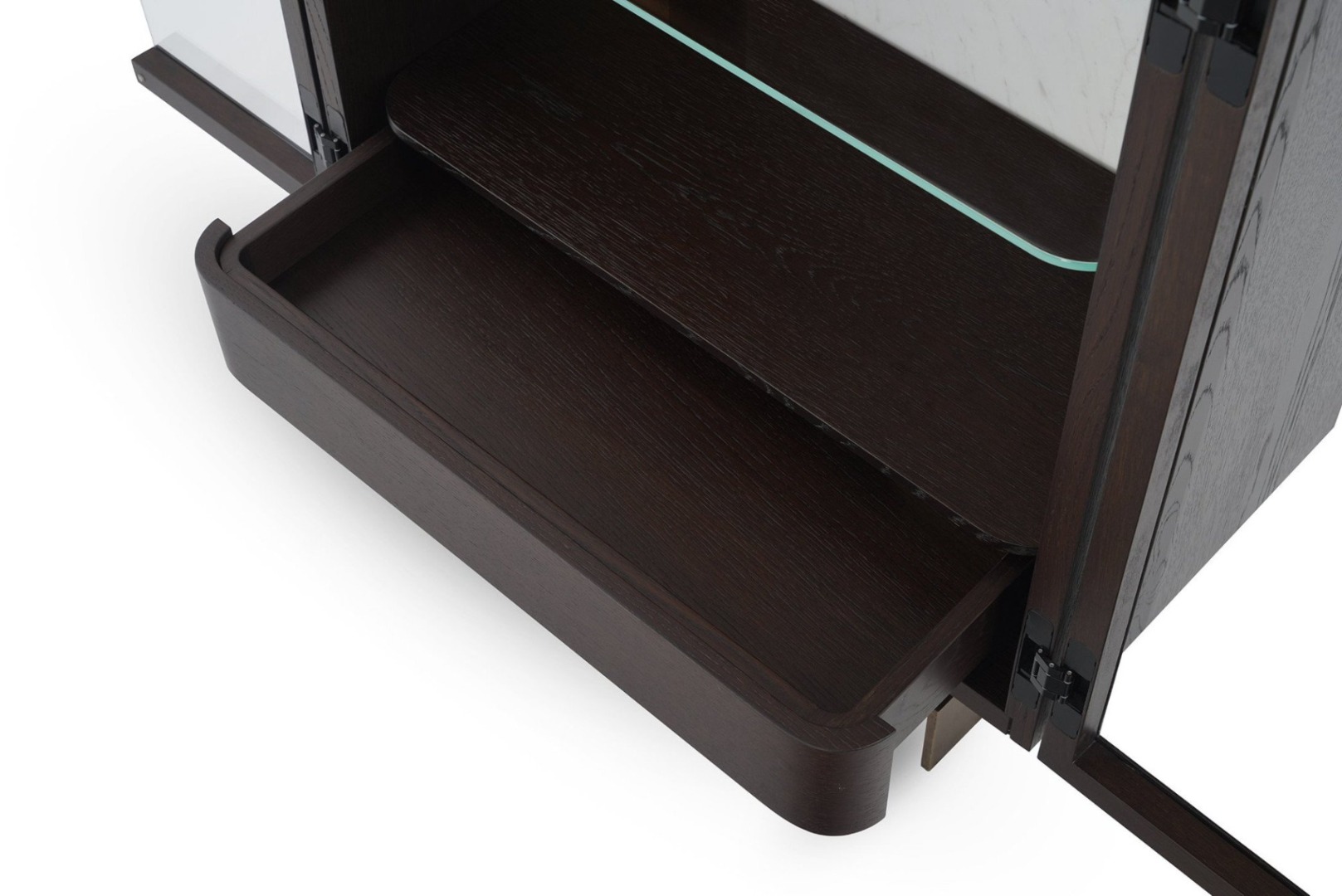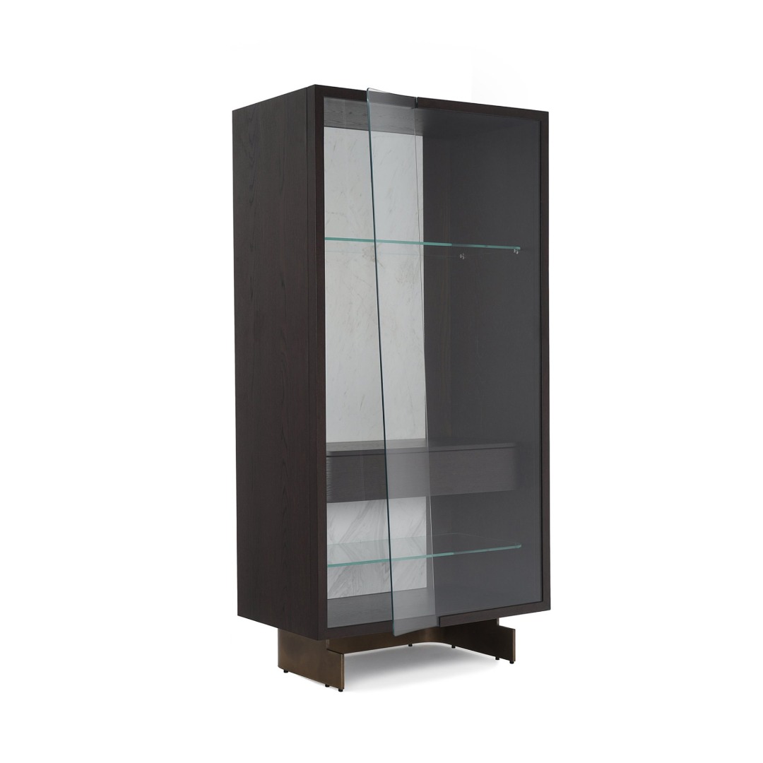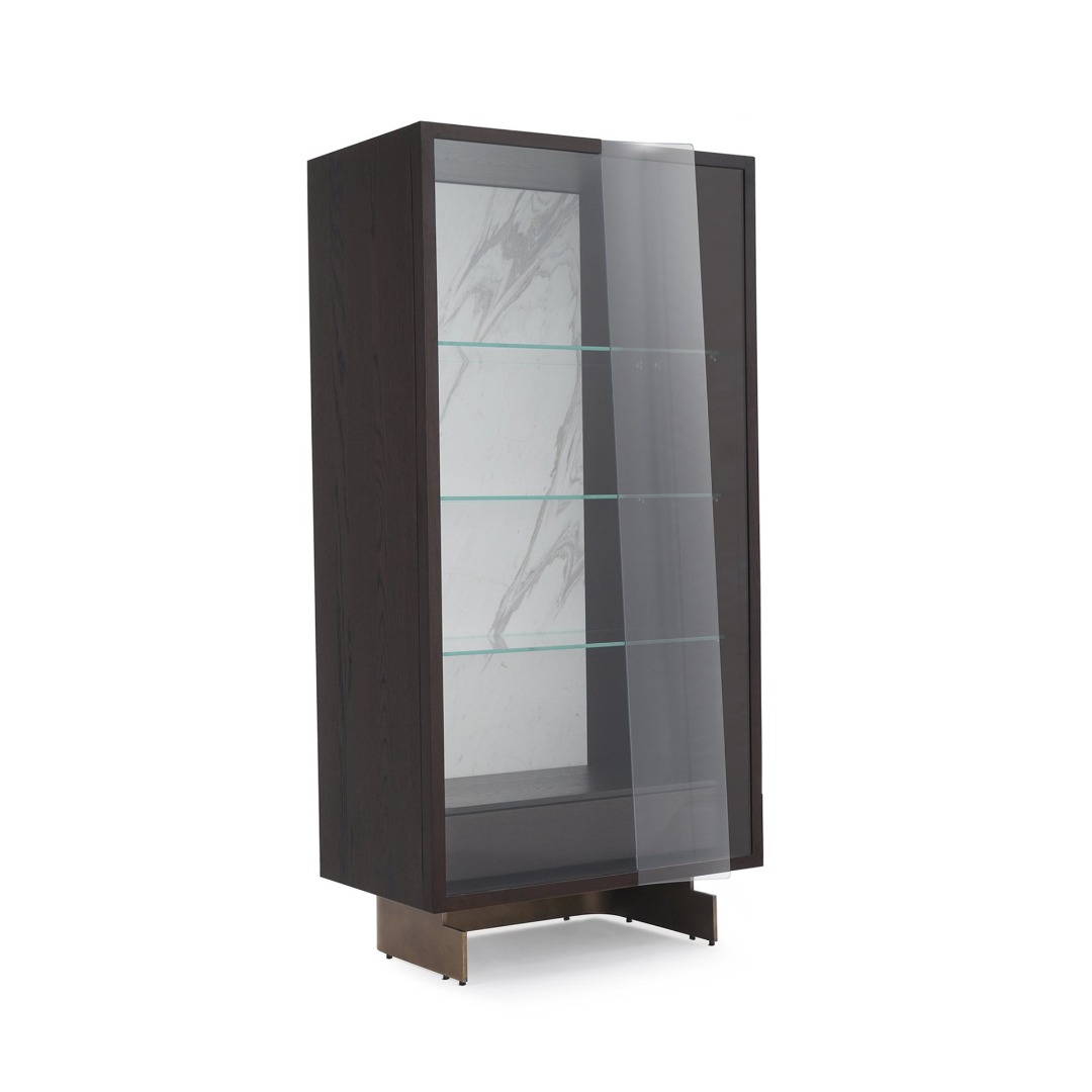 In harmony with the other members of the collection, Leaf Showcase stands out with almost impossible curves of its clear glass doors, produced by the prestigious glass-makers of Istanbul, a city known for its three century-long glass art tradition. The rectangular case furnished with glass racks and a wooden drawer is available in two distinct shelving layouts. The showcase serves as a shrine for personal treasures with its LED illuminated interior made of marble and wood veneer and creates a dazzling backdrop for any furniture combination. The sleek metal legs elevate the unit and intensify the massive character of the design.