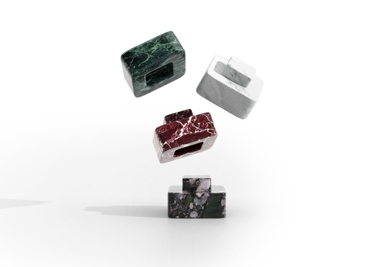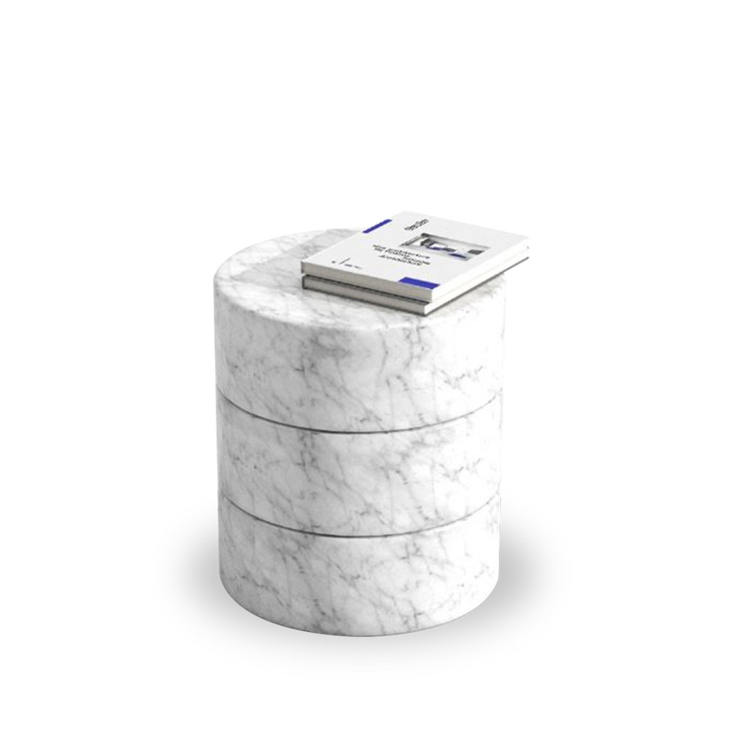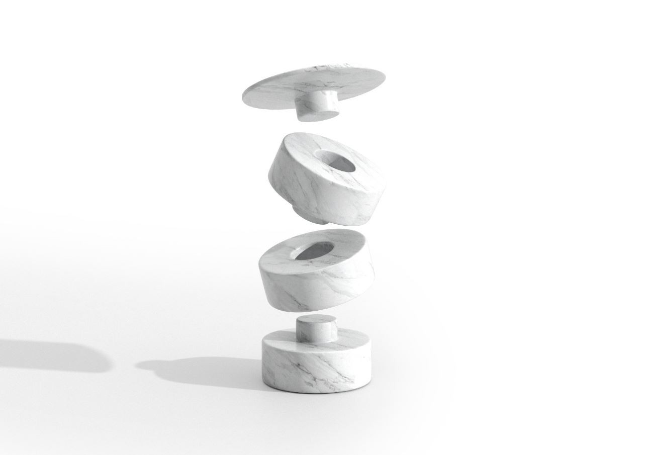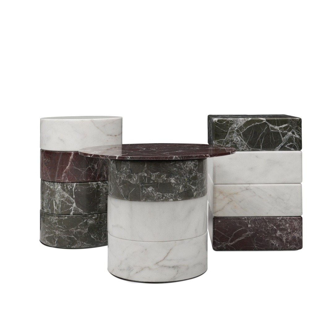 Evocative of the Greek column orders, Luna Coffee Table stands upon a medley of solid marble blocks with interlocking Lego-like modules and comes in three different forms with various combination options. The marble is obtained from the abundant quarries of Anatolia, a land blessed with one of the largest and excellent quality natural stone reserves in the world, and is substitutable with locally produced travertine. The concrete materiality of the design delivers a tactile and worldly offset to the soft surfaces the surrounding seating units provide. The natural veining of the modules lends each table a distinctive character. Luna Coffee Table A has an additional tabletop module with the same interlocking properties and marble/ travertine options. Luna Coffee Table B can be used as a part of a cluster, recreating the heights according to diverse needs. Luna Coffee Table C is the cuboid version of the unit B. The modular design enables an array of functions, a single coffee table or a cluster of low tables placed in the center of any furniture set or a single-unit side table as well as an assertive plinth for objets d'art.