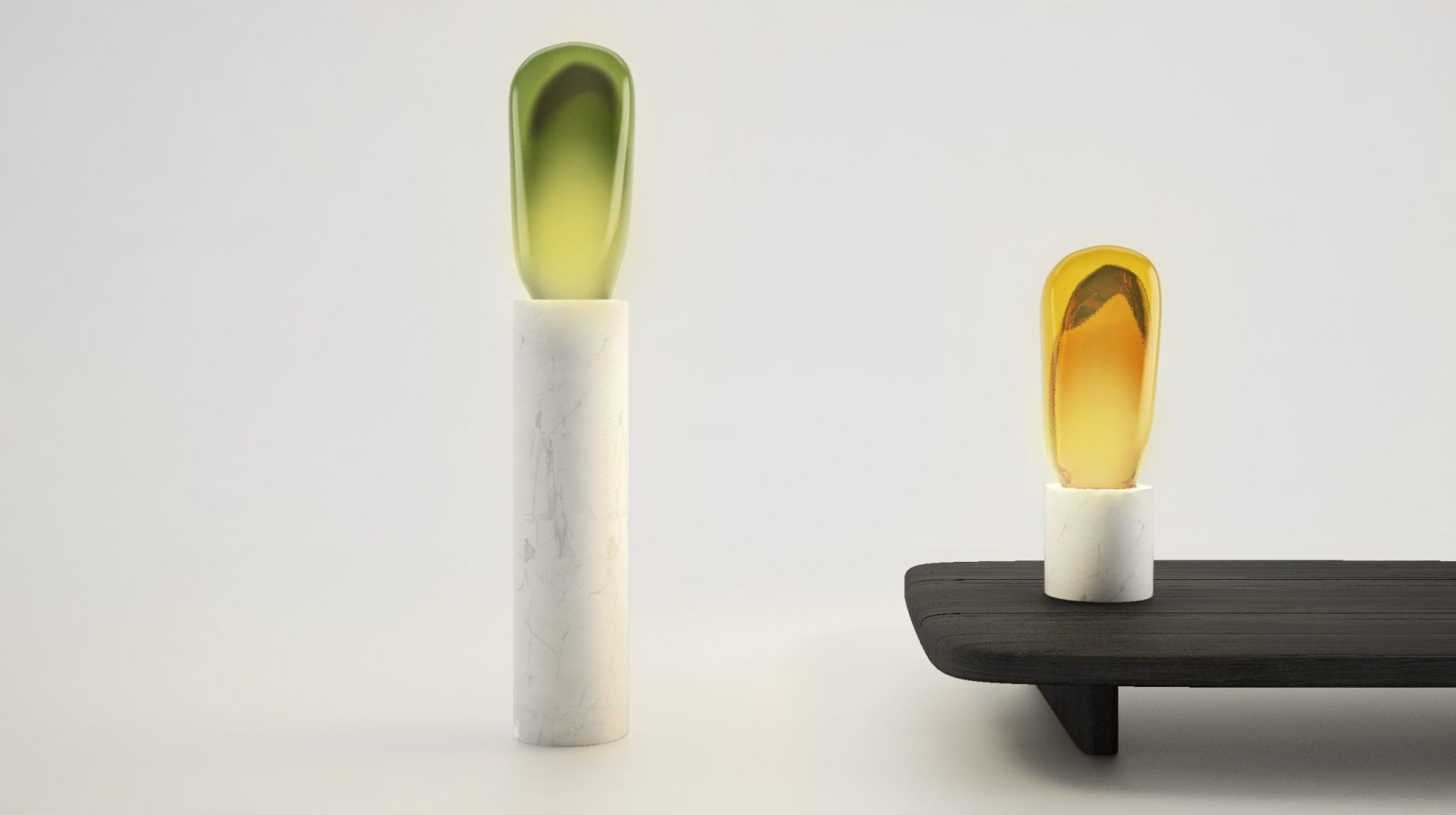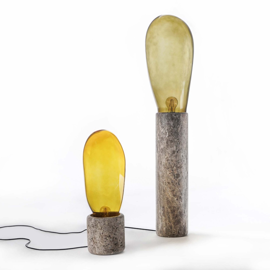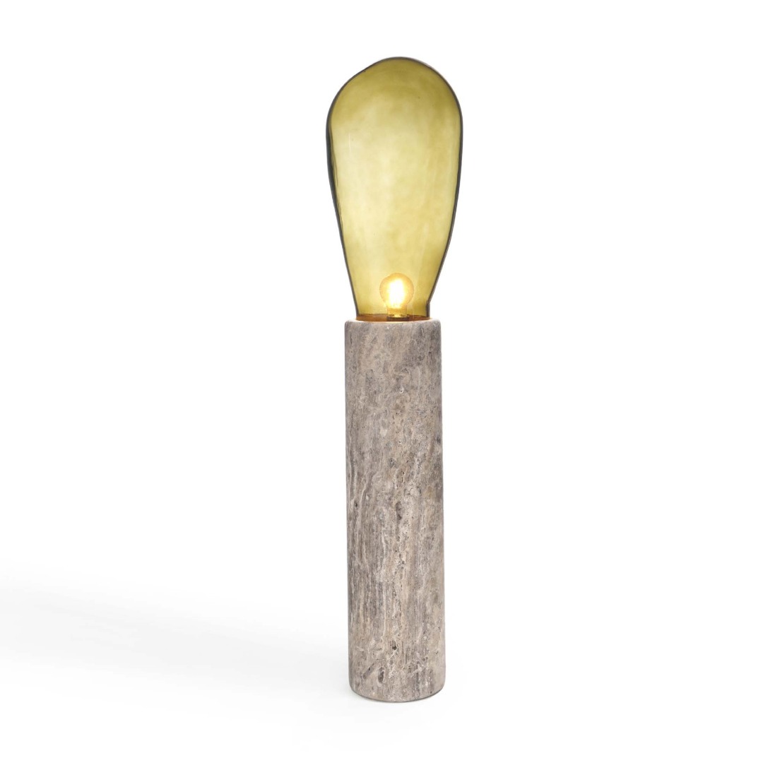 In 50 BCE, eastern Mediterranean glassmakers discovered the mouth-blowing technique and spread it to Anatolia to help this art prosper. Not much has changed since then; the Anatolian glassmakers have been among the best in their profession. A quality contemporary product manufactured by the local artisans, OPHELIA is a premium mouth-blown tinted glass lighting set of two. The hollowed-out marble pillars come in two different heights to extend the functionality of the table lamp to a floor lamp. The design outshines in the light of its highly abstract, bold lines to comply with imposing interiors. Available in five colors: Mustard, blue, smoke-grey, green, and amber.