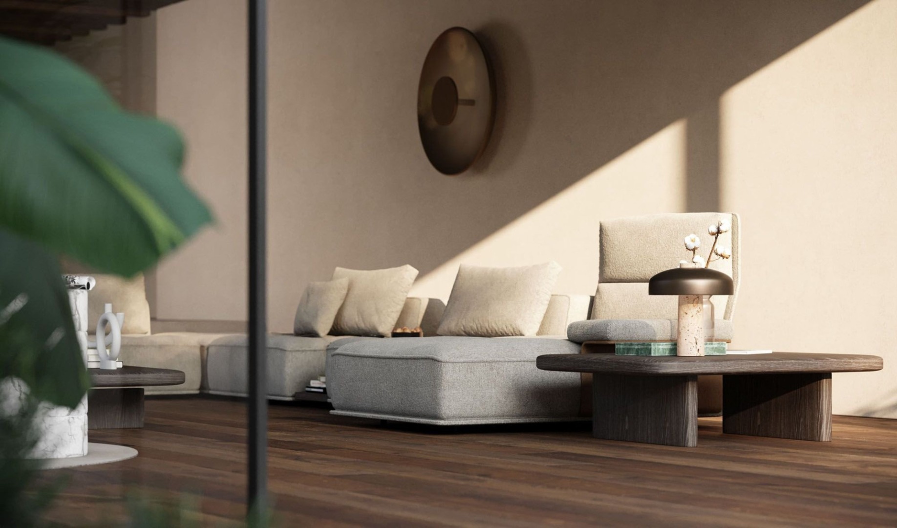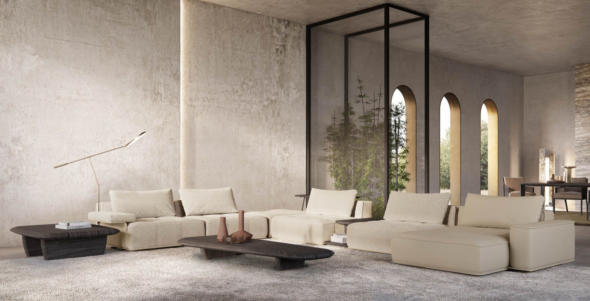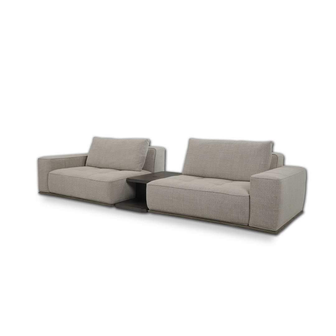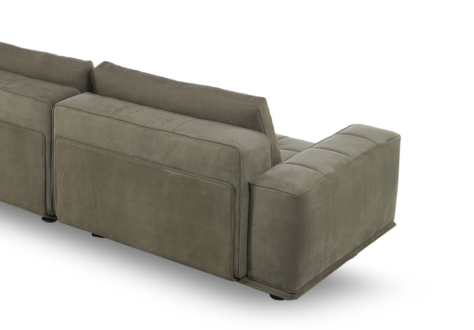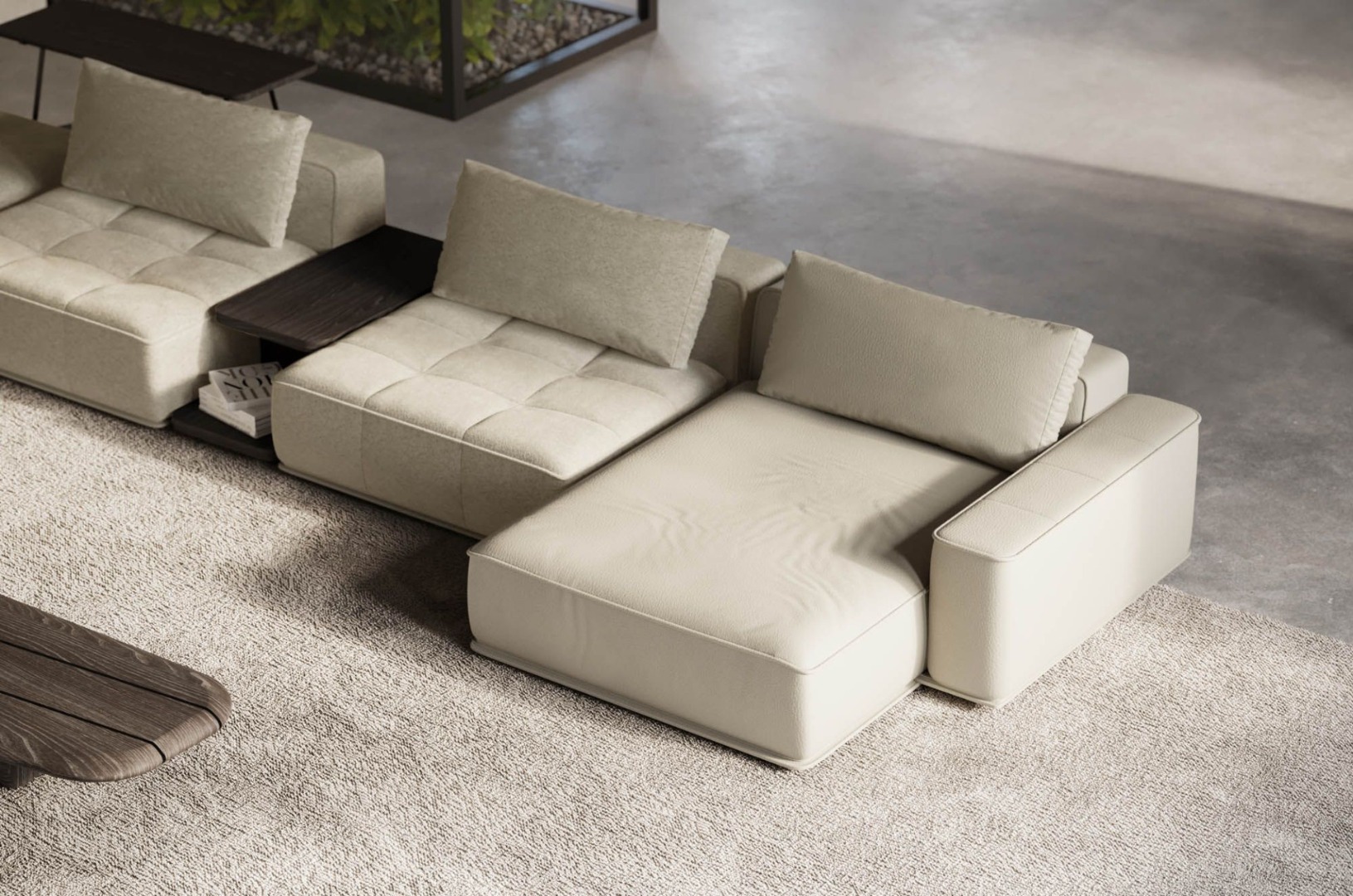 An art lover/collector's fave due to its dignified lines that do not compete with works of art, Soho Sofa is a formal systems furniture with versatile composition possibilities. The metal frame covered in leather or nubuck supports the base and gently curls towards the rear to grasp the backrest and emphasizes the continuous, horizontal setting of the sofa. The metal frame is slightly hoisted from the floor to provide a hovering effect. The primary seating unit clusters the high or low back daybed modules, a rectangular side table equipped with a built-in wireless charger, and a LED reading lamp. Armrests come in two options; a massive, cuboid end module and a lightweight, floating horizontal joint element. The latter constitutes a junction between an attached or self-standing side table and the seater. The side table module has different wood veneer options, and the seaters come in fabrics like velvet and bouclé, in addition to leather or nubuck. The graphic upholstery stitching is a tribute to the traditional French padding technique, capitonné, applied on particular modules to create diverse surface textures and give way to inventive compositions.