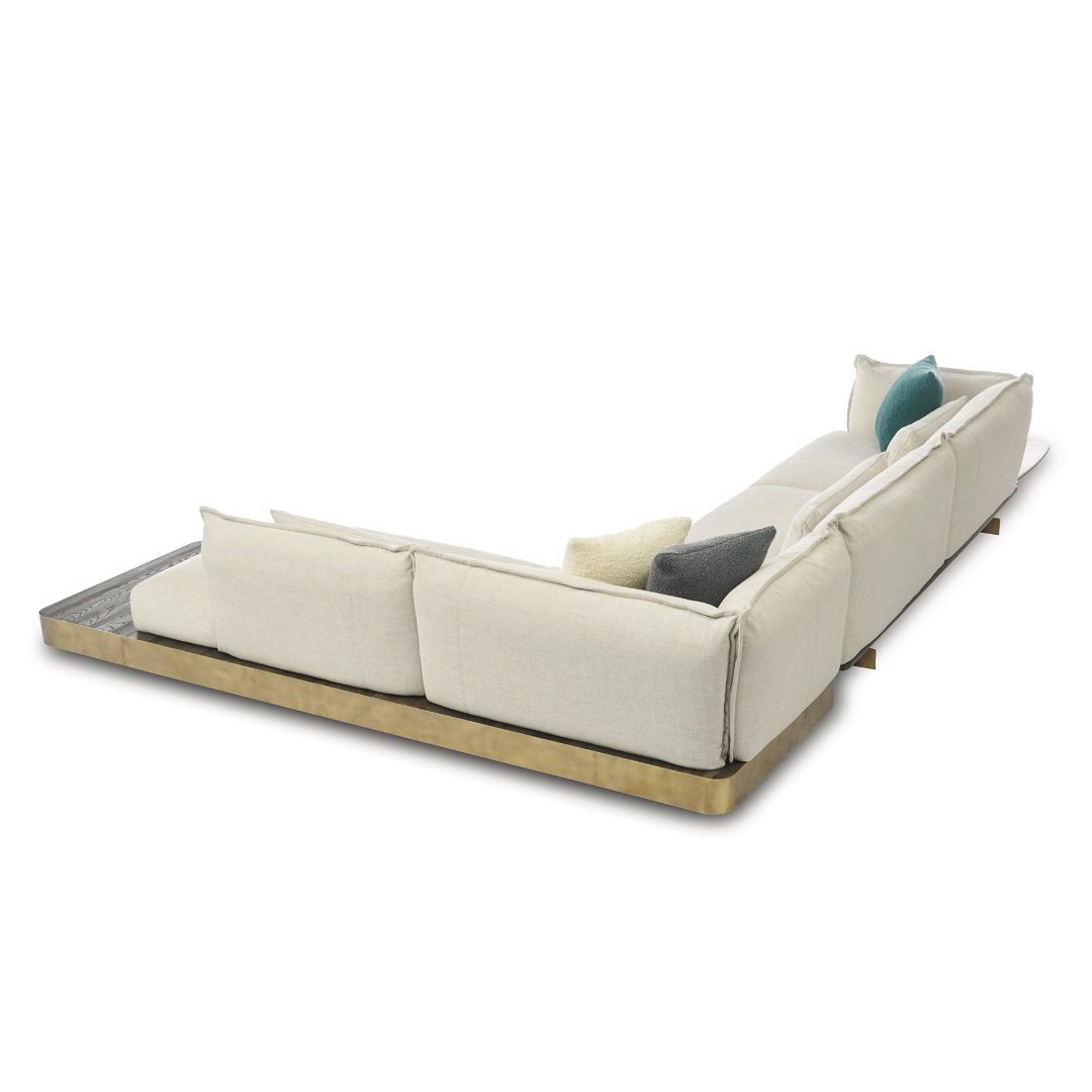 Make room for comfort and elegance in your life. Combining dark oak painted cracked chestnut with metal, travertine, fusion glass and the comfort of goose feather, the Stratos Sofa infuses original lines and comfort in life.