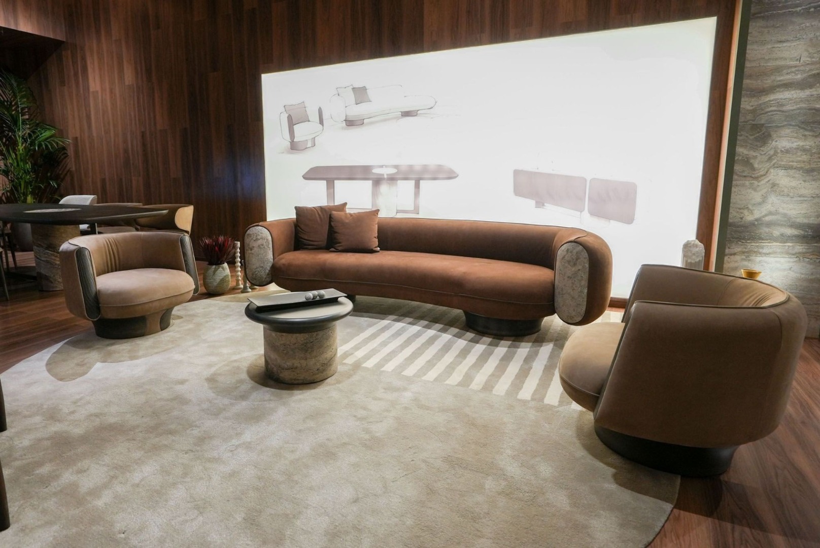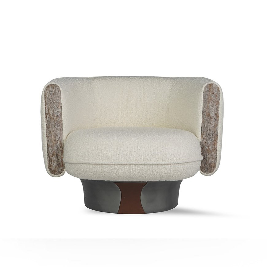 Self-indulgent in form, Epicurean in character, Suspence Armchair stands out with its glamorous posture in any room and offers high comfort to the user. Whether combined with the other members of the Suspence family or used separately, it works as an accent chair and creates a focal point in space while pulling together the look and feel of the decor. The tilted, outcurved forearm details come in locally produced rough travertine, solid wood, and polished marble with various colors and textures. Metallic painted wood veneer gently wraps the conoid leg and frames the leather front detail. Fabric and leather upholstery are available in diverse colors and textures.