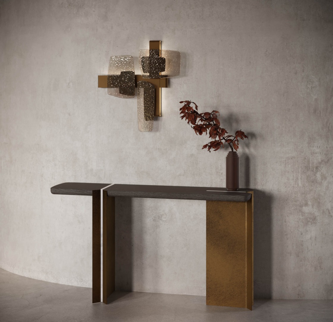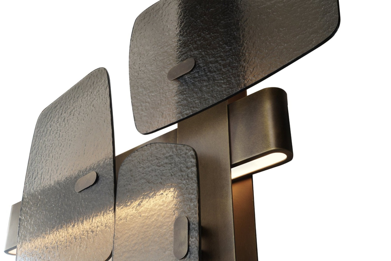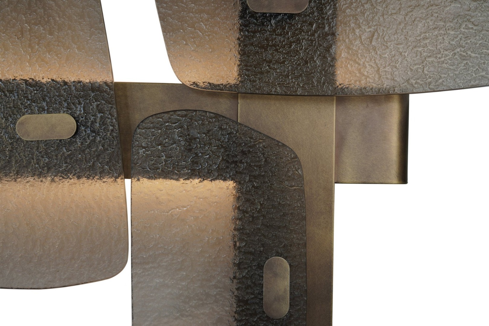 Extraordinary lines and creativity met in this design. The combination of fusion glass and metal was designed to create space arithmetic with high gusto.