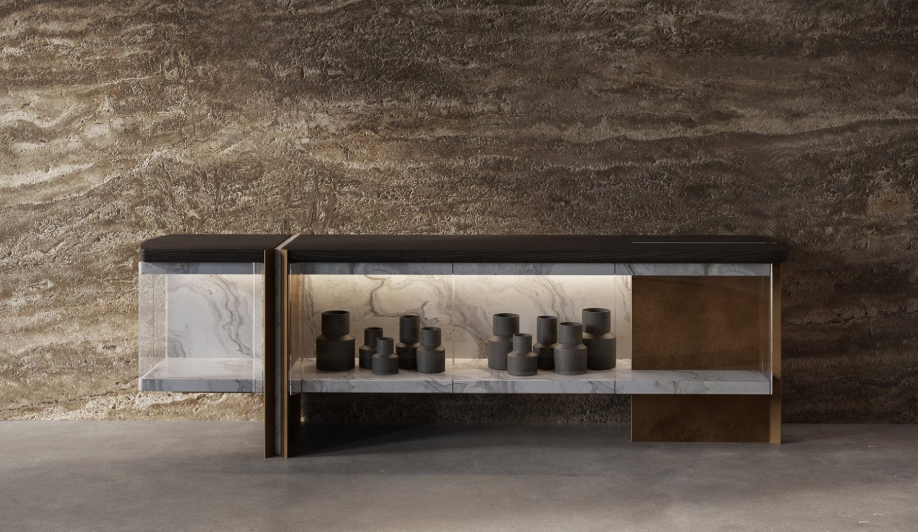Saydam, havada asılı gibi duran cam gövdesiyle güncel dekorasyon trendlerini takip eden Foil Konsol, tek gövdede çift işlevli bir ünite: konsol ve vitrin. Tasarıma hükmeden sesi kısılmış maksimalist yaklaşım ürünü gerçek bir başyapıt olarak mekânın odağına yerleştiriyor. İnceltilmiş mermer fonu ve kumlanmış masif ahşap üst tablası ile cam gövde, kışkırtıcı endüstriyel unsurlarla destekleniyor ve güçlendiriliyor. Mermer şeritlerle zarif bir şekilde bağlanmış kırlangıç kuyruğu formundaki metal ayaklar, zenginleştirilmiş zarafet tanımına bir gönderme. Uzaktan kumandalı LED ışık havuzu ile donatılan cam gövdenin dışa eğimli kapıları, metal kırlangıç kuyruğu taşıyıcının eğimine birebir uyumlu. Ürün, renkli cam seçenekleriyle daha cesur, daha ağır bir karaktere bürünüyor.