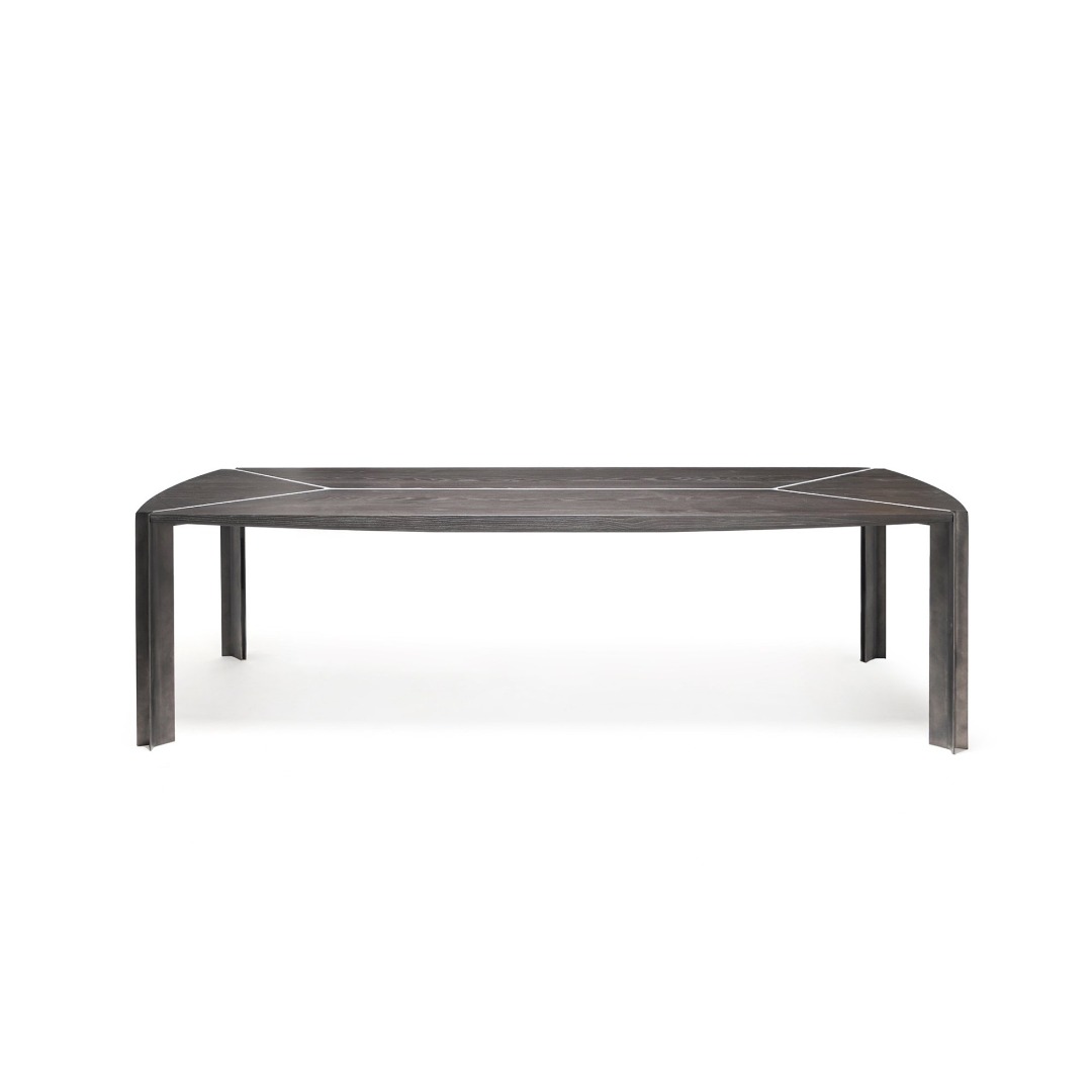 Minimalist ancak ayakları yere basan, lüks bir tasarım olan Foil Masa, Le Corbusier'in Ronchamp Şapeli'ne ince göndermeler barındıran zarif bir mobilya. Uzaktan 10 kişilik, dört ayaklı sıradan bir masa gibi görünen ürün, yakından bakıldığında, incelikli işçilikle bir araya getirilmiş üç farklı malzemenin; kumlanmış masif ahşap, mermer ve metalin kusursuz birlikteliğini ortaya koyuyor. Mermer şeritlerle vurgulanan kırlangıç kuyruğu formundaki metal ayaklar, ahşap tablanın altına gizlenmiş desteğe bağlanıp, masayı bir arada tutuyor. Ayaklardaki mermer şerit detayı tablanın ahşap parçaları arasındaki derzlere de yerleşiyor. Ürüne önden bakıldığında göze çarpan, ortasına hafif bombe verilmiş masa tablası, Ronchamp Şapeli'nin kıvrımlarından ilham alıyor. Tablanın kemerli uçları ise, benzer bir tasarım kararını gözler önüne seriyor.