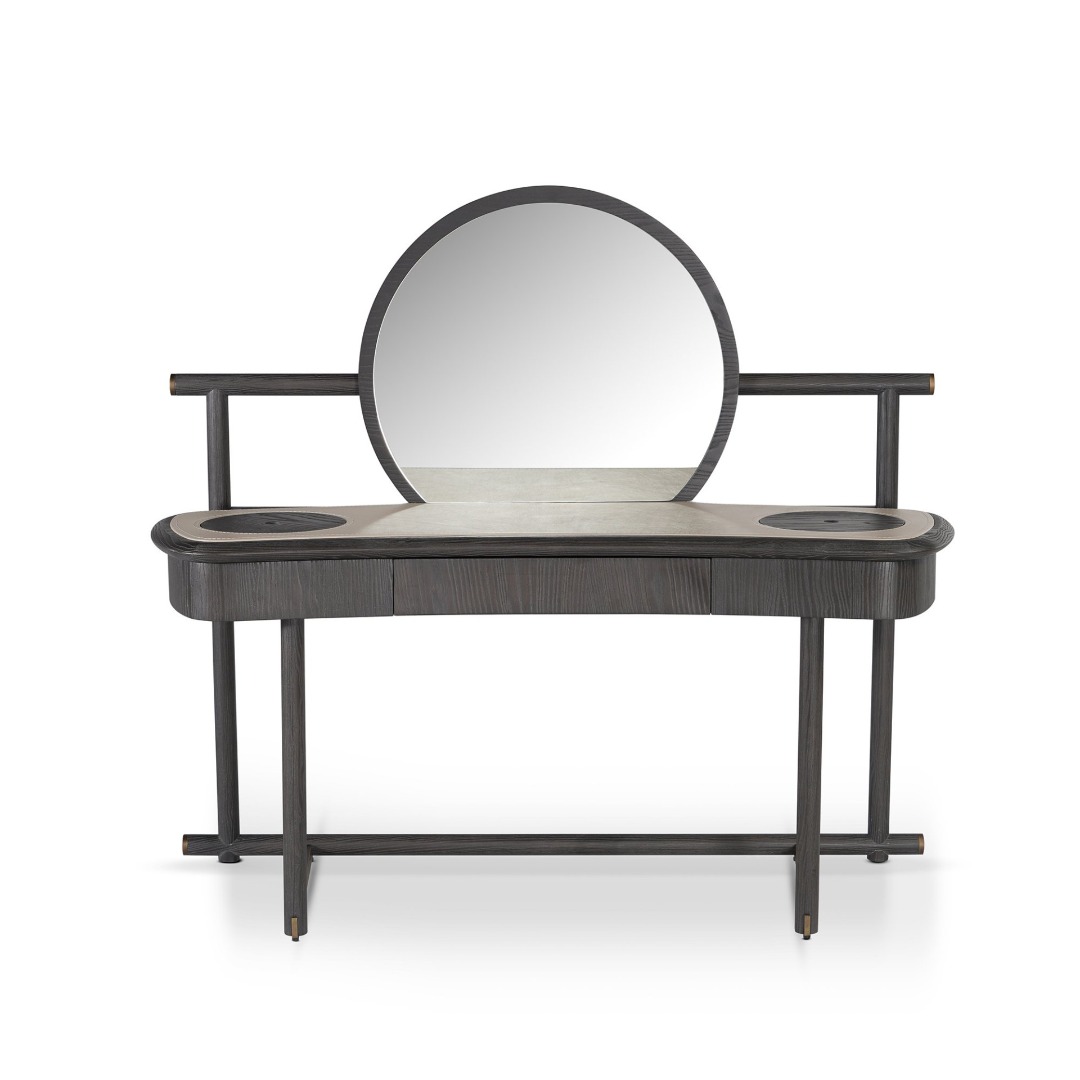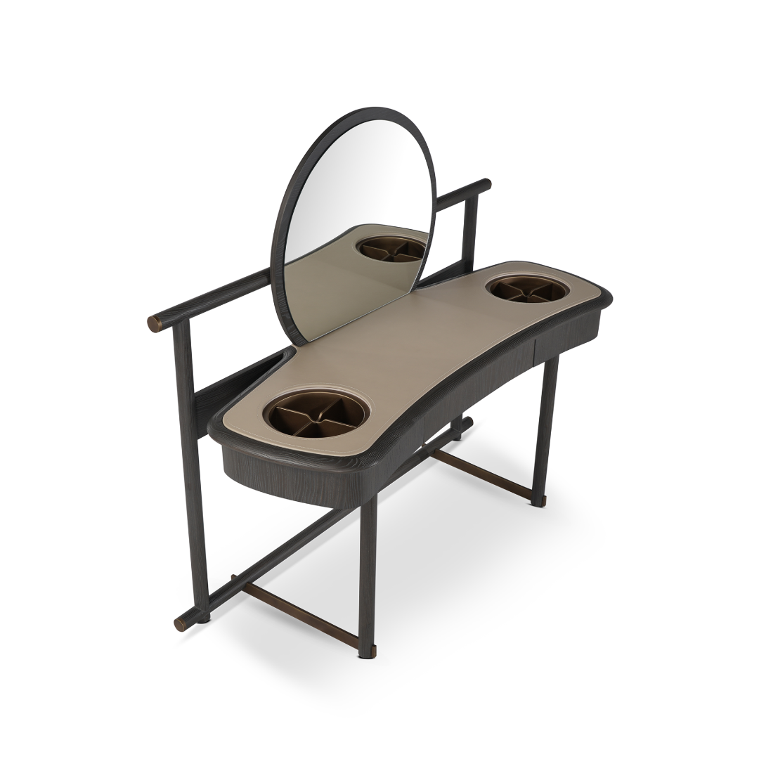 Sökülebilir bir ayna, ön çekmece ve masaya gömülü, ahşap kapaklı iki yuvarlak cep ile donatılmış Kimono Dresuar, sıra dışı geometrik kütleleri ve ahşapla metali bir araya getiren etkileyici birleşim detaylarıyla öne çıkan bir mobilya. Fasulye formundaki çekmeceli masası, aynı seriye ait yatağın başlığına benzeyen ahşap bir çerçeveyi kavrıyor ve üzerine oturuyor. Masanın üst tablası deri veya nubuk döşenebiliyor. Metalik boyalı masif ahşap gömme cepler, içlerine yerleştirilmiş esnek ayırıcılar sayesinde takı ve küçük makyaj malzemelerini birbirine karıştırmadan depolamaya yarıyor. Döşeme, ahşap ve metal kısımlar farklı renk/doku seçeneklerine sahip.