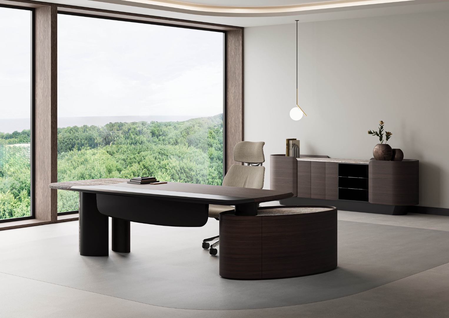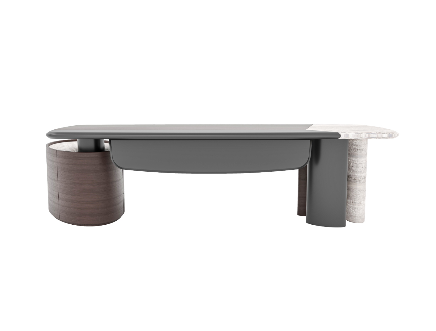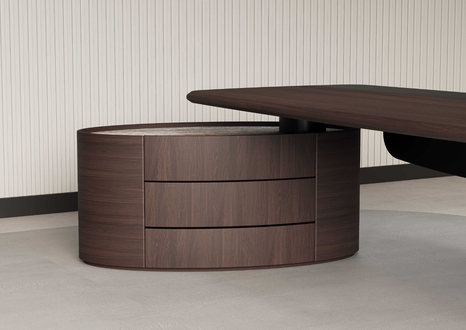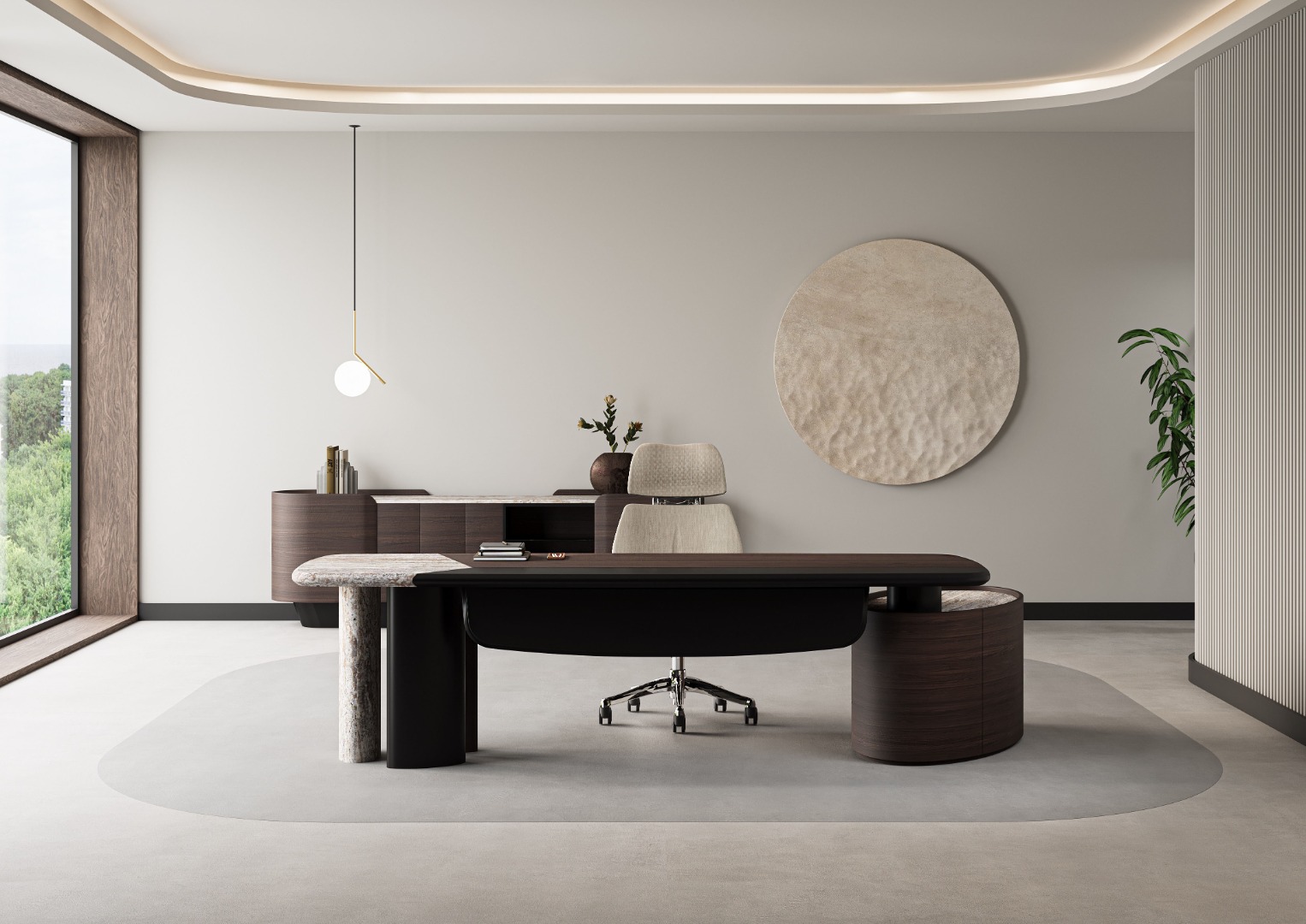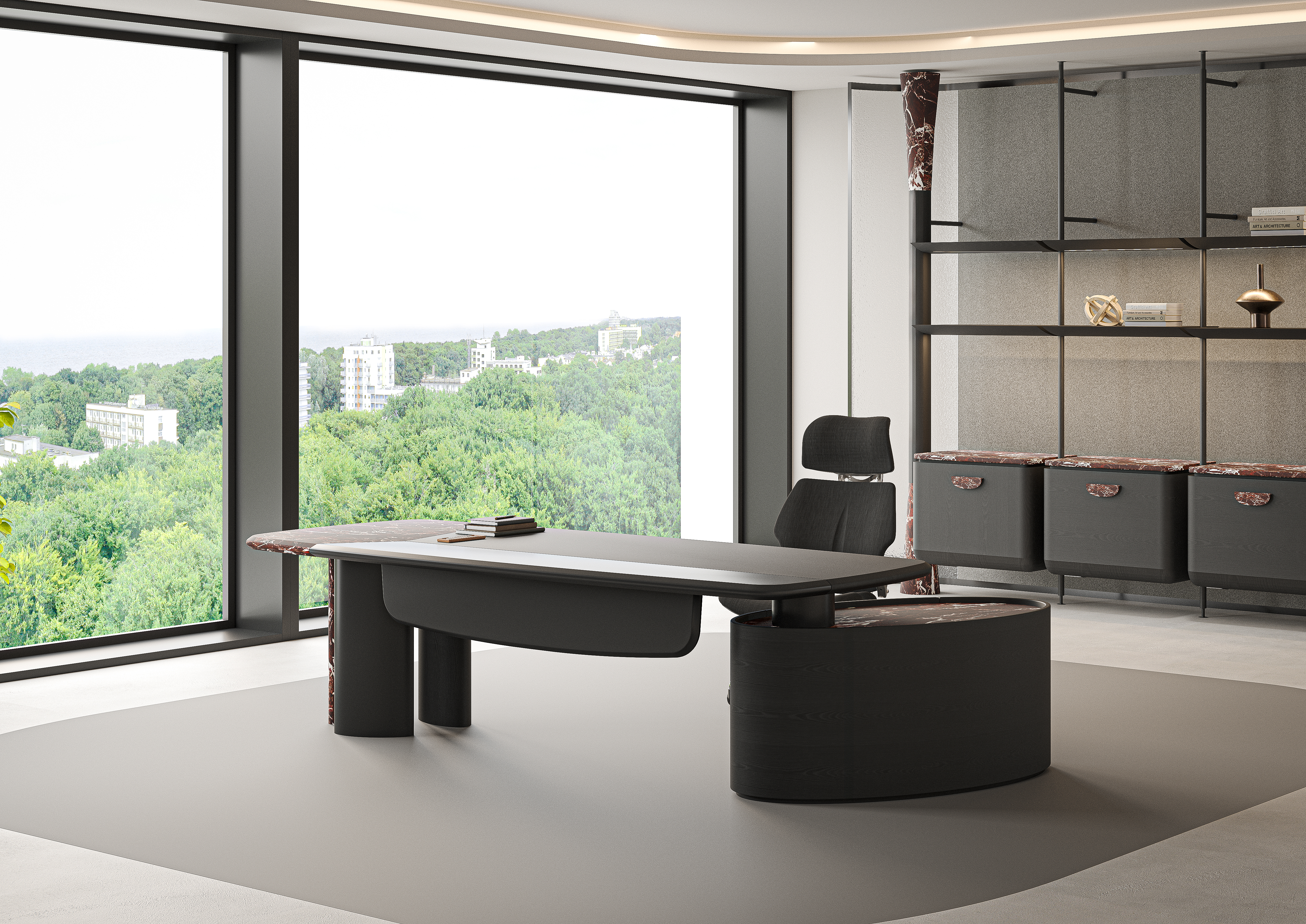 Kütlesel dengesi ve oval çizgileriyle mekânda sakin ama güçlü bir varlık oluşturur. Lorca, yalnızca bir çalışma alanı değil; yöneticinin mekânla kurduğu ilişkinin mimari bir parçasıdır.