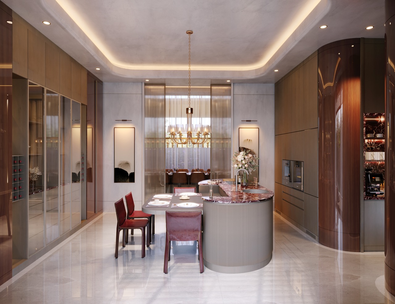 Nexus Regnum mutfakları; yüksek tavanlı hacimlere özel tasarlanmış, çift ada düzeni, geniş depolama çözümleri ve doğal taş–doğal kaplama birlikteliğiyle öne çıkar. Mermer yüzeyler, doğal ahşap kaplamalar ve mat yüzeyler; hem estetik hem de uzun ömürlü kullanım kriterleri gözetilerek seçilmiştir.