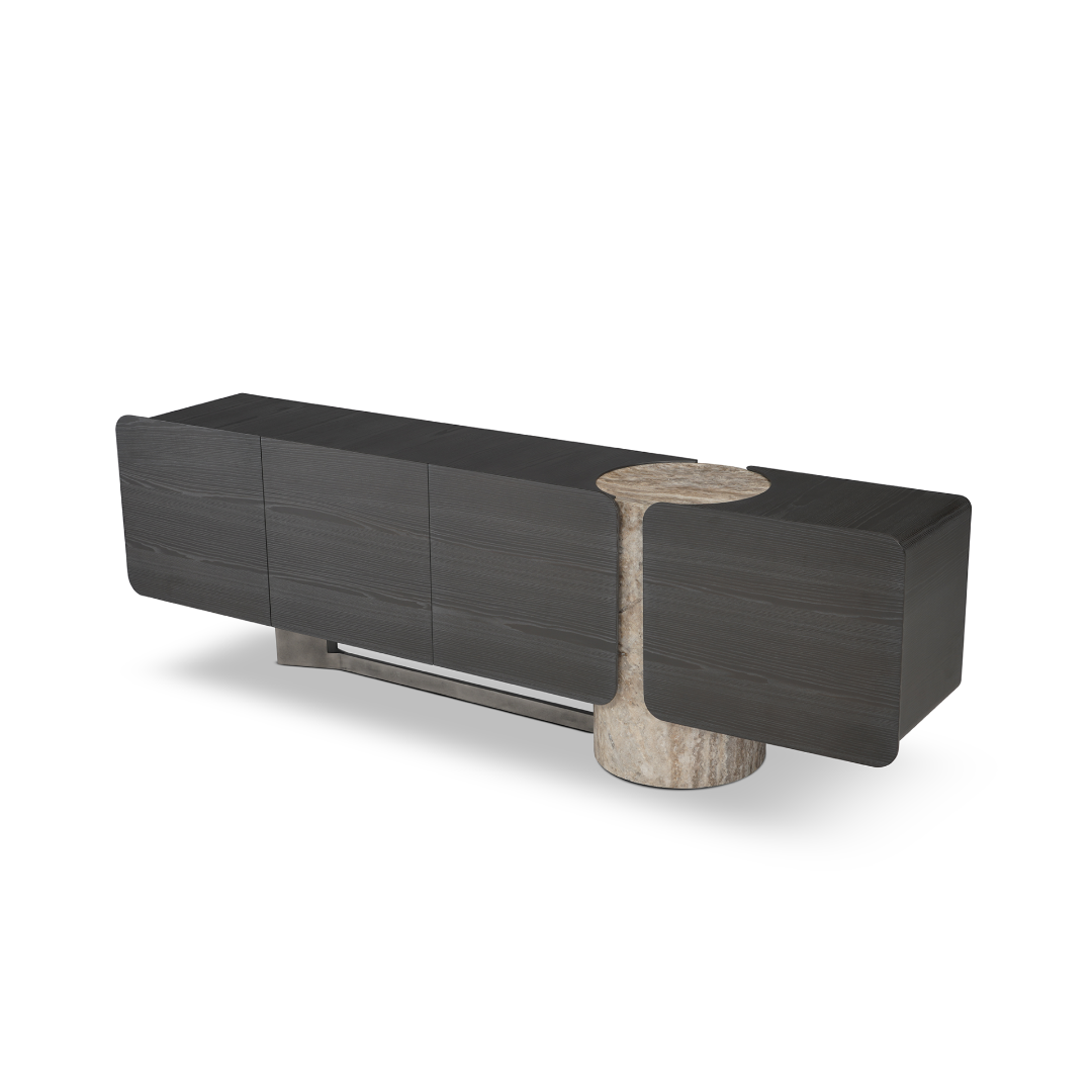 Koleksiyonun belirgin asimetrik ve yuvarlatılmış çizgilerini takip eden Titano Konsol'un gövdesi, içi boşaltılıp hafifletilmiş taş sütunun etrafına tutunan iki farklı boyut ve formda kübik kütlenin birleşmesinden oluşuyor. Dolap kapakları arasında yaratılan boşluk, kasanın tavanına kadar uzanan sütun ayağın somut, taş dokusunu ortaya koyuyor. Çekmeceli uzun kanadı destekleyen ve uca doğru açılıp kırlangıç kuyruğu formuna kavuşan incecik metal ayağın parlak, keskin ve pürüzsüz görüntüsü ahşap dolabın yuvarlatılmış köşeleri ve mat, kumlanmış, pütürlü yüzeyiyle bir zıtlık dengesi yaratıyor. Tüm malzemeler yerel üreticilerden temin ediliyor. Taş sütun ayak, traverten ve mermer seçeneklerine, masif ahşap kapaklar, ahşap kaplama gövde ve metal yüzeyler çok sayıda renk alternatifine sahip.